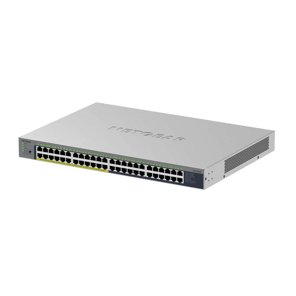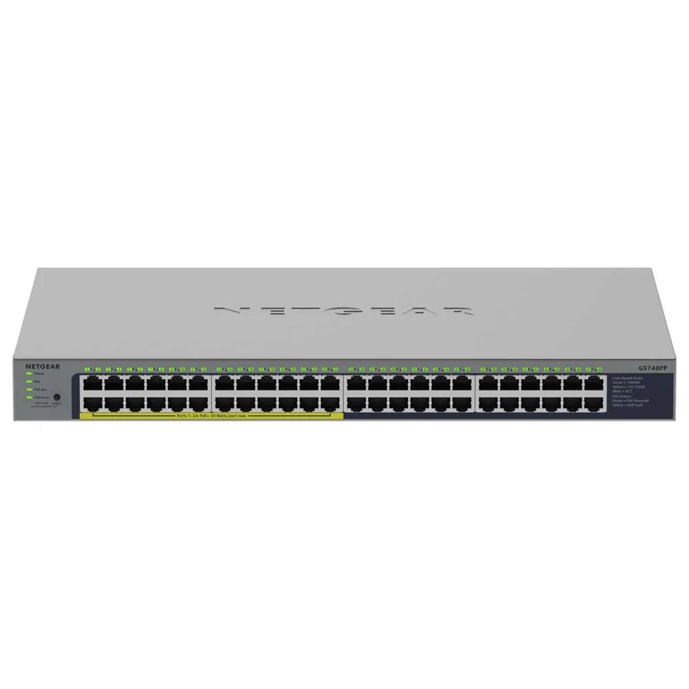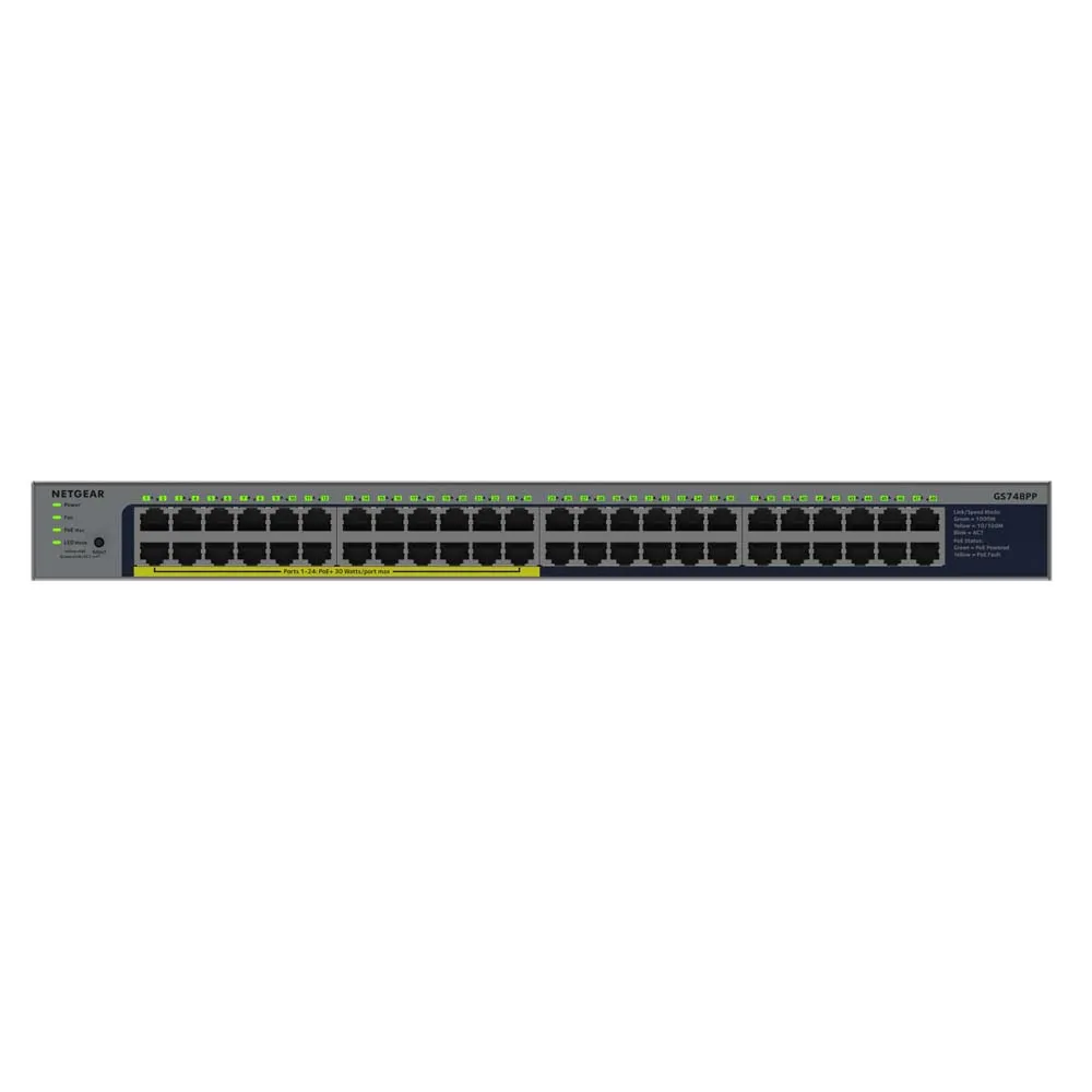 48 x Gigabit Ethernet ports with 24 ports of PoE+ Plug and play switch, no management required Energy Efficient Ethernet for maximum power savings Dynamic fans for quiet operation Rackmount or desktop.