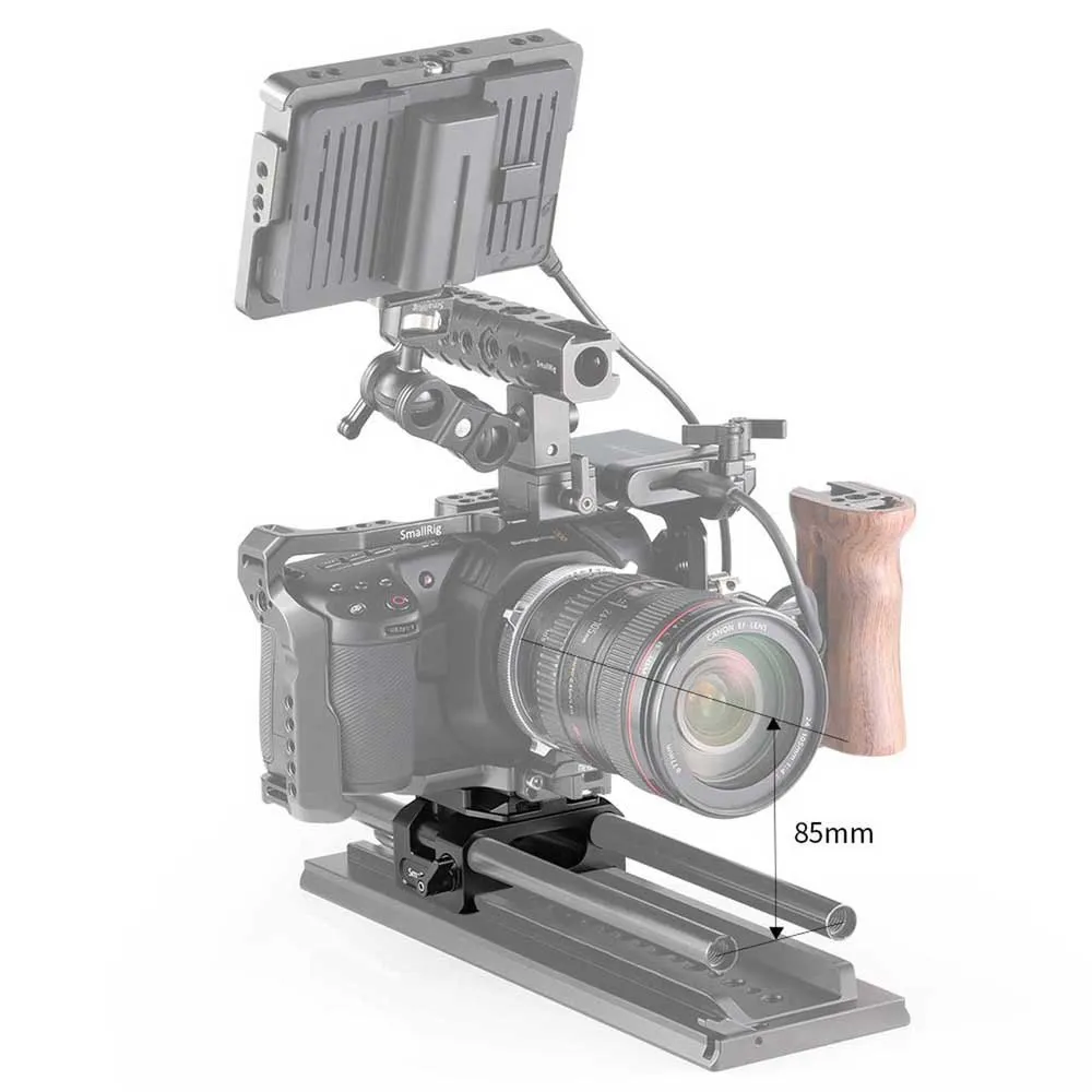 Piastra di base SmallRig per Blackmagic Design Pocket Cinema Camera 4K e 6K (compatibile Manfrotto 501PL) DBM2266 è una piastra di base dedicata che fornisce supporto per binario da 15 mm ad un'altezza dell'asta di 85 mm. È progettato per funzionare con SmallRig Cage 2203 e CVB2254. Sulla parte superiore c'è la piastra QR e il ricevitore compatibili Manfrotto, dove la gabbia può essere montata rapidamente. Al centro c'è un morsetto per binario da 15 mm per aste SmallRig da 15 mm 1053, dove è possibile collegare accessori come il kit per spallacci SmallRig 2077, supporto per obiettivo SmallRig 2152, scatola opaca, follow focus e kit maniglia per spallacci SmallRig 998. Viene fornito con una coda di rondine ARRI integrata sul fondo che può essere montata direttamente sulla piastra a coda di rondine standard ARRI SmallRig 1463. Inoltre, ci sono più fori filettati da 1/4 e 3/8 sul fondo della piastra di base in modo da poter fissare altre piastre per treppiede.