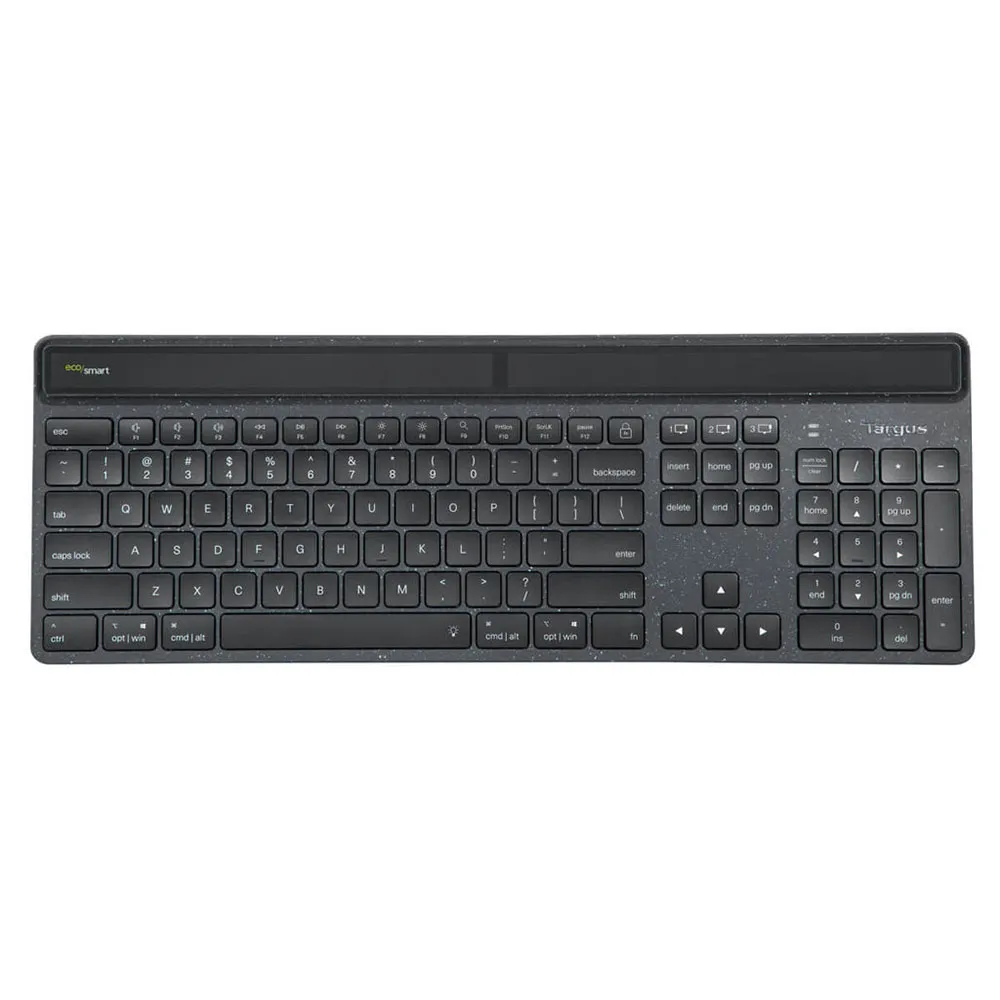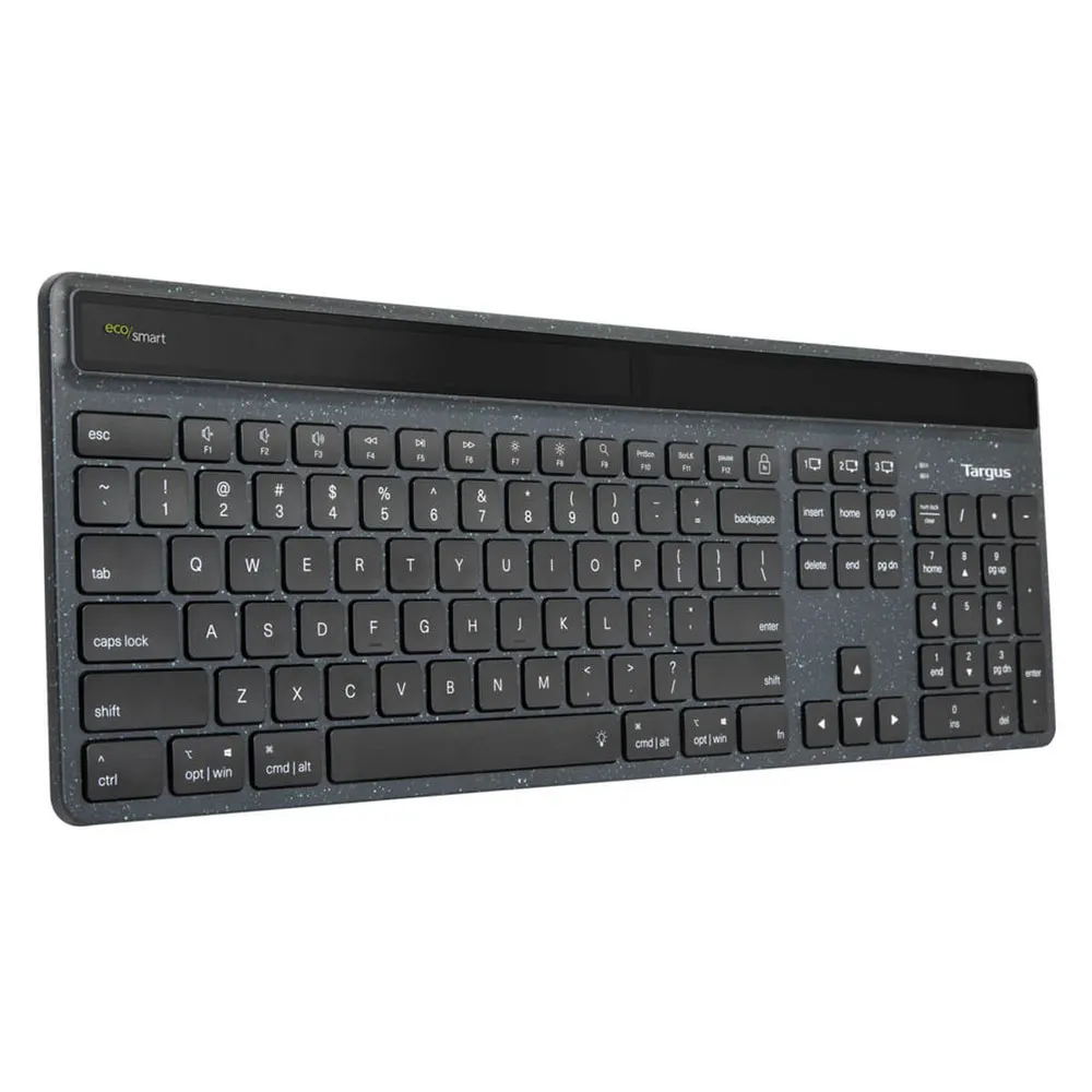 The Targus® Sustainable Energy Harvesting EcoSmart™ German-language Keyboard combines Bluetooth® and advanced solar technologies with post-consumer recycled materials in an eco-friendly, full-size keyboard.