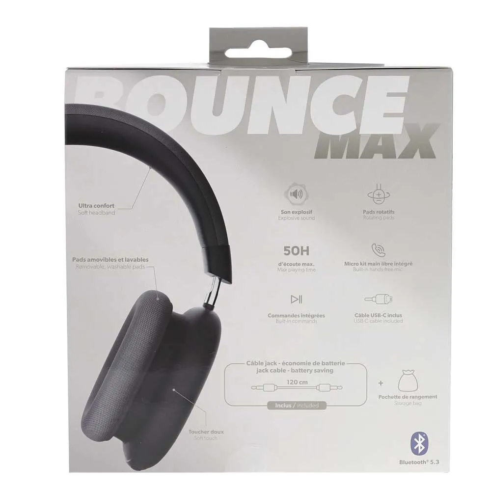 Le cuffie BOUNCE, sufficienti ad aumentare tutte le sensazioni della tua musica. Grazie al formato super-avvolgente, le cuffie BOUNCE offrono una riduzione passiva del rumore e isolano naturalmente i leggeri rumori circostanti. Comode e leggere, sono un accessorio di moda a tutti gli effetti. La combinazione di crea uno stile elegante e misterioso. I suoi cuscinetti in tessuto sono rimovibili e lavabili. Le cuffie si connettono via Bluetooth e offrono fino a 50 ore di autonomia. Puoi usarle anche in modalità cablata grazie al cavo jack da 3.5 mm incluso. Qualunque sia la modalità d´uso, goditi una qualità del suono mozzafiato. Le cuffie sono dotate di pulsanti di controllo e di un microfono: gestisci le tue playlist ed effettua chiamate senza usare il tuo smartphone. BOUNCE, le cuffie che ti fanno muovere.