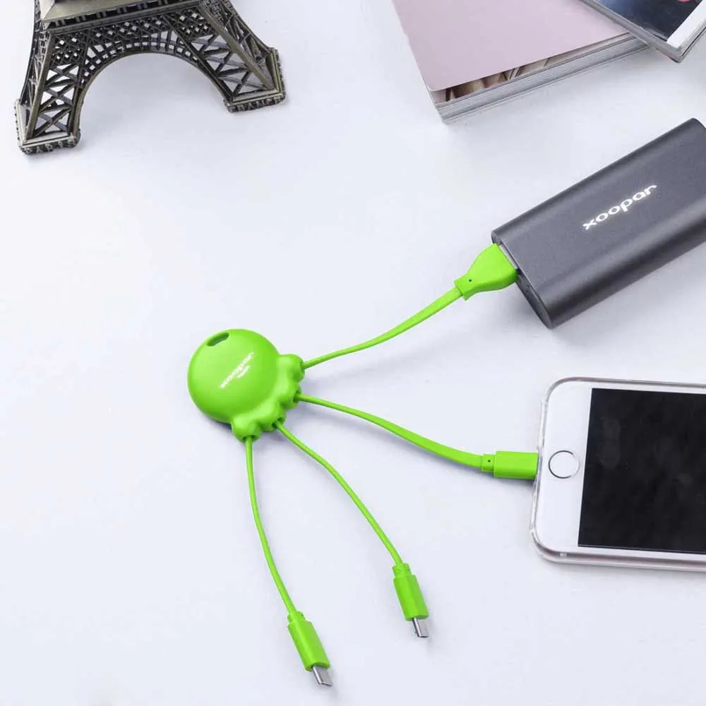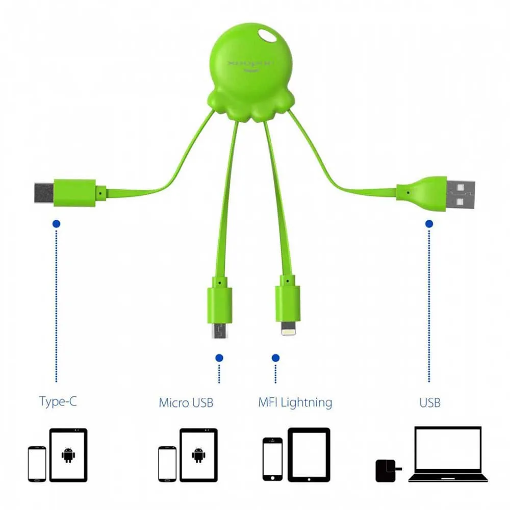 La soluzione multicavo portatile per tutti i tuoi smartphone dotati di adattatori USB, micro USB, Type C e Lightning. Collega USB con power bank o adattatore CA e qualsiasi adattatore corretto con il tuo smartphone per la ricarica. Non preoccuparti più dei cavi disordinati, il robusto cavo intrecciato di Octopus non si aggroviglia nelle tue tasche. Include un foro per portachiavi per la portabilità.