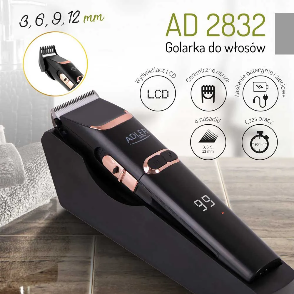 De haarknipper Adler 2832 biedt u professioneel en nauwkeurig haar knippen met behulp van een keramisch mes. Efficiënte batterijen maken het mogelijk om de tondeuse zelfs een paar uur te gebruiken, maar indien gewenst kan deze ook altijd met snoer worden gebruikt. De haarknipper kan worden opgeladen met een oplader. Bovendien is de tondeuse uitgerust met 4 verschillende opzetkammen: 3, 6, 9, 12 mm. Het LCD-scherm geeft precies aan hoeveel batterijduur er nog over is en wanneer we moeten beginnen met opladen of werken op netstroom.