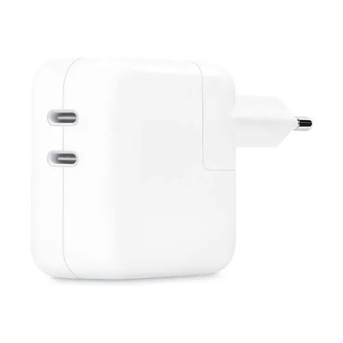 De stroomadapter met twee 35W USB-C-poorten kunt u twee apparaten tegelijk opladen thuis, op het werk en onderweg. Apple raadt aan deze te gebruiken met de MacBook Air, hoewel deze ook compatibel is met de iPhone, iPad, Apple Watch en AirPods.