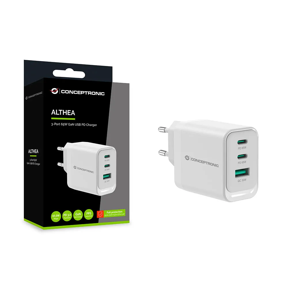 Conceptronic ALTHEA21W65 3-Poorts 65W GaN USB PD Oplader, USB-C x 2, USB-A x 1, QC 3.0, PPS, PD 3.0.
