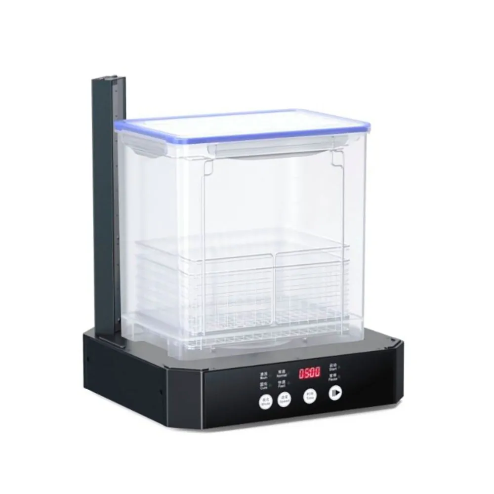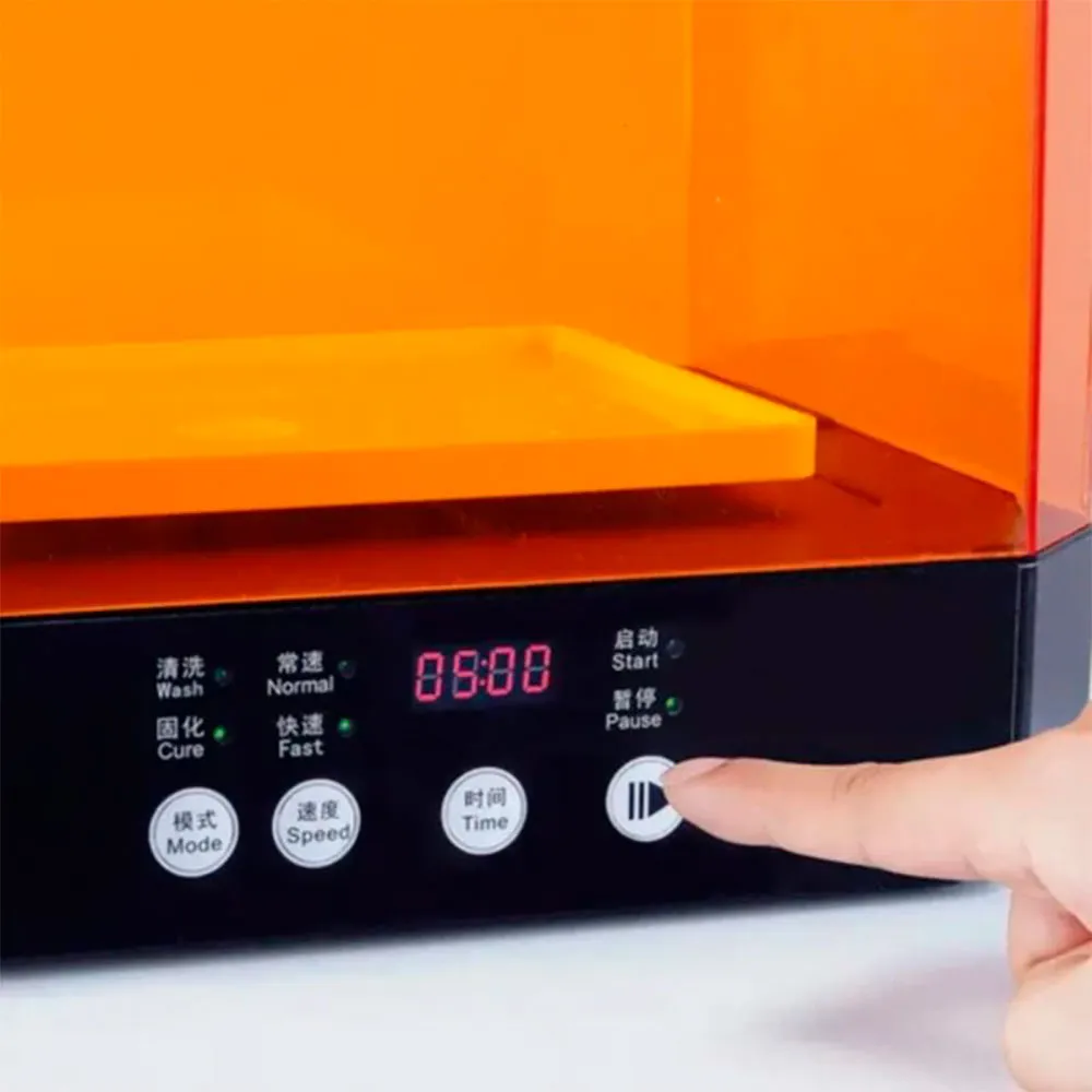 - UV-dop: Ja, het uithardingsproces stopt als de UV-dop niet op zijn plaats zit. - Afgesloten container: Voorkomt lekken, morsen en vervluchtiging van vloeistof tijdens het wassen. Controle en functionaliteit: - Snelheids- en tijdaanpassing: Binnen enkele seconden in te stellen om het wassen/uitharden aan te passen op basis van hars, modelgrootte en complexiteit.