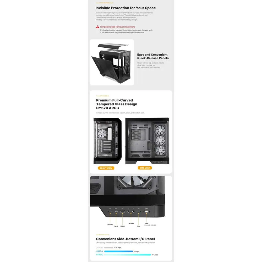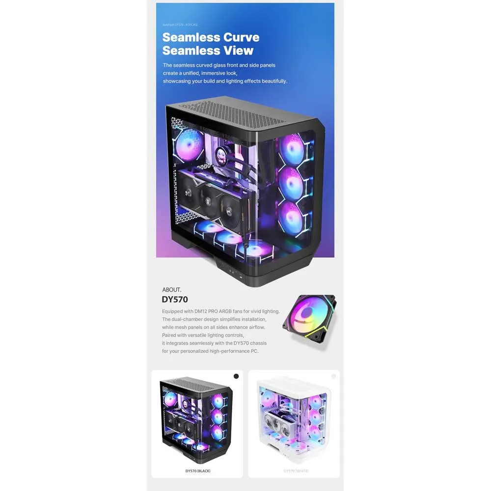 Ruim & Veelzijdig Interieur: Als een grote mid-tower behuizing biedt de DY570 voldoende ruimte voor high-performance hardware. Het biedt comfortabel plaats aan full-size ATX-moederborden, extra lange grafische kaarten tot 410 mm en hoge CPU-luchtkoelers. Deze royale ruimte zorgt voor een gemakkelijke en plezierige bouwervaring zonder compromissen.