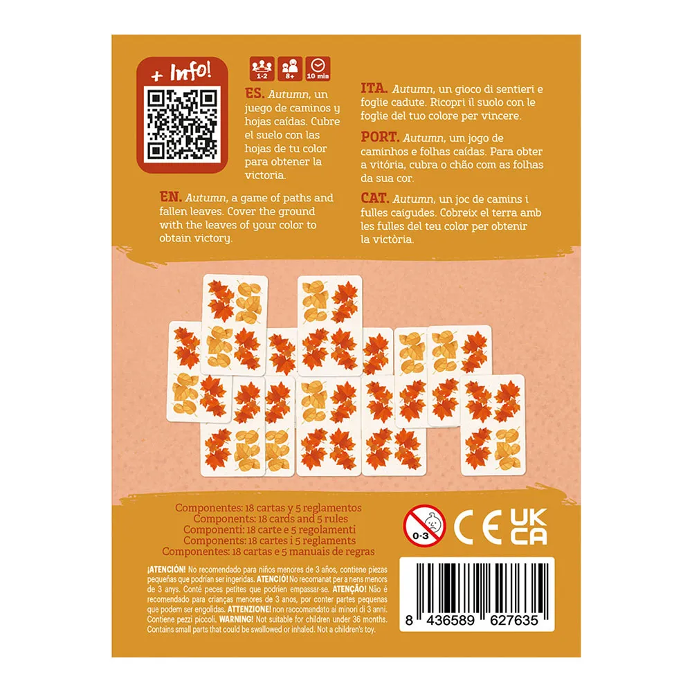 Dit spel moet besteld worden in veelvouden van 6. De herfst arriveert en het landschap kleurt oranje en oker. Beetje bij beetje verliezen de bomen hun bladeren, die op de grond vallen en kleurrijke tapijten vormen. Jij en je metgezel zouden de bladeren uit de tuin kunnen verzamelen, maar eerst kun je aan iets leukers denken: je kiest een soort blad en na een paar bewegingen met de hark wint degene die het grootste gebied met zijn groep kan creëren. Zullen we beginnen. Ontworpen door María Blasco en Enrique Blasco (hoewel deze twee broers en zussen ook bekend staan als Brote de juegos) en geïllustreerd door Carlos Ureta, is Autumn een spel uit de 4 seizoenen-saga dat wordt toegevoegd aan de Devir-pocketcollectie. Als je Winter al kent, een titel van dezelfde auteurs en die ook deel uitmaakt van de saga, dan zal dit spel je erg bekend voorkomen. Met slechts 18 kaarten die vier groepen bladeren van twee verschillende kleuren tonen, zorgt Autumn voor snelle spellen voor 2 spelers of solo, vanaf 8 jaar. Als je te lui bent om de regels te lezen en te leren, hoef je je geen zorgen te maken over dit spel, want er zijn maar heel weinig regels om te onthouden. Om te beginnen, schud je alle kaarten en leg je ze op een stapel met de verborgen bladeren. Draai de eerste kaart om en leg deze op tafel. De startspeler (willekeurig gekozen) draait een andere kaart om en speelt deze bovenop de eerste. De tweede speler kiest, voordat hij aan de beurt begint, de kleur bladeren waarmee elke speler zal spelen: rood of geel. Na deze beslissing draait die speler een nieuwe kaart om, speelt deze en geeft de beurt door. Het spel gaat normaal gesproken verder waarbij beide spelers elkaar afwisselen totdat het kaartspel op is. De belangrijkste regel om te onthouden is dat kaarten altijd bovenop de andere kaarten op tafel worden gespeeld, in dezelfde richting: het is mogelijk om ze 180 graden te draaien, maar niet 90. Bij het plaatsen van de kaart moet deze een of twee spaties van bladeren bedekken, niet meer en niet minder. De overlappende ruimtes kunnen van elke kleur zijn, ze hoeven niet overeen te komen. Zodra alle kaarten zijn geplaatst, wint degene met het grootste gebied van verbonden bladerruimtes van zijn kleur het spel. Bladerruimtes worden alleen als verbonden beschouwd als ze orthogonaal aan elkaar grenzen, dat wil zeggen, aan de zijkanten raken, niet aan de hoeken (diagonale ruimtes worden niet als verbonden beschouwd). De winnaar kan de overwinning echter nog niet vieren! Autumn is ontworpen om in drie rondes te worden gespeeld. Nadat de derde ronde is afgelopen, tel je het aantal spaties dat elke speler krijgt op en vergelijk je deze om te zien wie de winnaar is.Aan de andere kant biedt de solo-modus drie verschillende uitdagingen: tuin, balans en twee. In deze spelmodus wordt het spel gespeeld door met beide kleuren tegelijk te spelen, waarbij ook geprobeerd wordt om gebieden te creëren met bladeren van dezelfde kleur. Afhankelijk van de gekozen uitdaging, scoren we op de een of andere manier. In de Tuin-uitdaging worden aan het einde de drie gebieden met de meeste bladeren (welke kleur ze ook hebben) gekozen en wordt het aantal vakjes in elk gebied geteld. De score voor dat spel is het laagste van deze drie getallen. In de Balans-uitdaging moet je drie exact dezelfde gebieden krijgen, met hetzelfde aantal vakjes in elk gebied. En tot slot, in de Twee-uitdaging, probeer je slechts twee gebieden te krijgen, zonder losse gekleurde vakjes buiten een van die twee gebieden. Herfst is de perfecte metgezel voor elke reis. Met zeer weinig componenten biedt het een zeer vermakelijke uitdaging, zowel voor het spelen als koppel of alleen. Competitie is gegarandeerd. De pocketcollectie wordt ook gekenmerkt door zijn lage kosten, binnen ieders bereik. Laat je betoveren door de kleuren van de herfst en begin te spelen met de bladeren.
