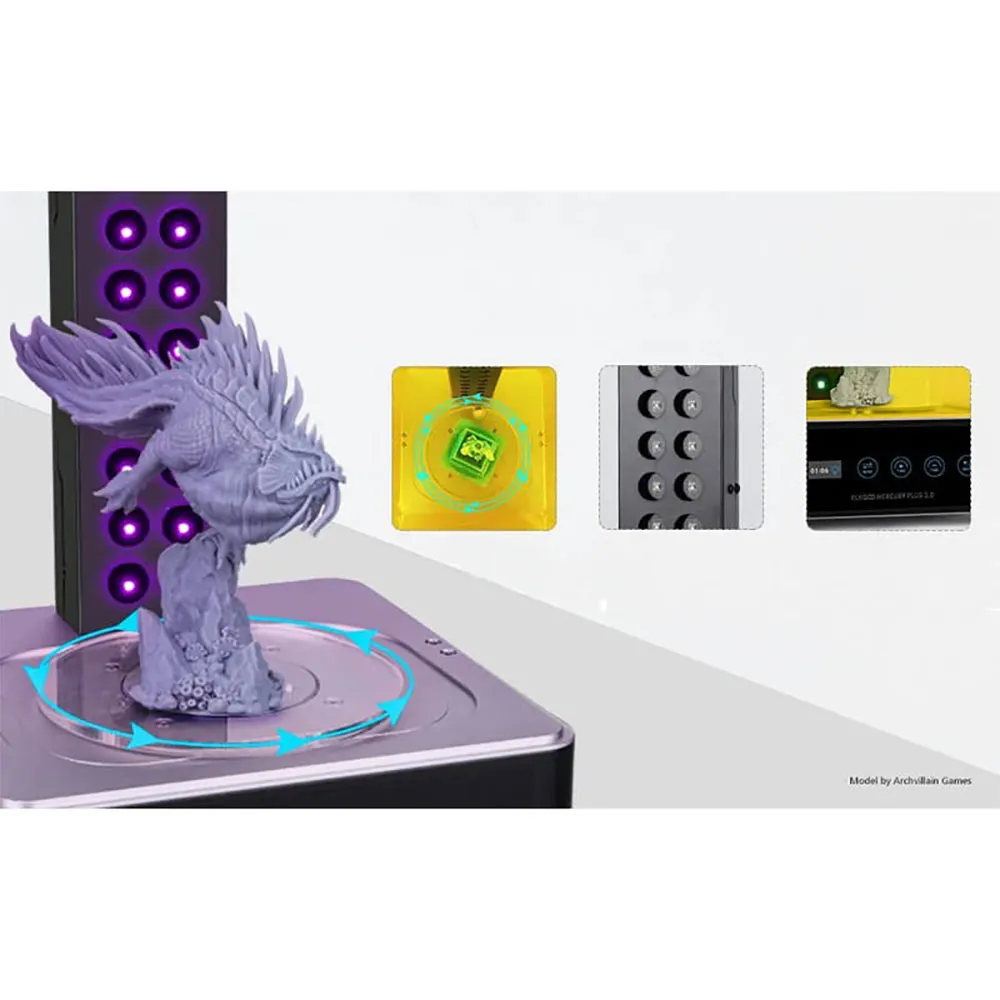 Ventilatorloze uithardingsmodus met 8 UV-lampen: - Het ELEGOO Mercury Plus 2.0-apparaat is uitgerust met 8 UV-lampen van 405 en 8 van 385 mm, vergezeld van een 360º draaiende plaat, waardoor de modellen gelijkmatig en volledig kunnen worden uitgehard.