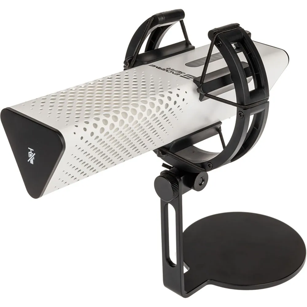 - Een metalen standaard wordt ook meegeleverd, die je thuis of onderweg kunt gebruiken. Hang je je microfoon liever op? Geen probleem. Met de geïntegreerde 3/8 inch-schroefdraad kun je hem op elk gangbaar statief monteren.