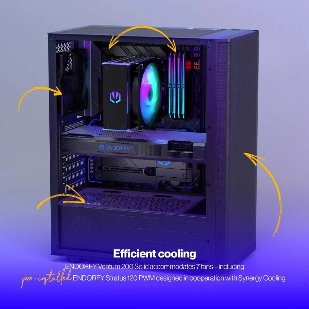 - We installeren een coole Stratus 120 PWM ventilator voor je – een cadeau, om je op weg te helpen. De Ventum 200 Solid kan ook vloeistofkoelers herbergen: tot 240 mm aan de bovenkant en 360 mm aan de voorkant van de behuizing. Met zulke specificaties (en een geperforeerd voorpaneel om de luchtstroom te verbeteren!), blijven je componenten koel als een briesje.