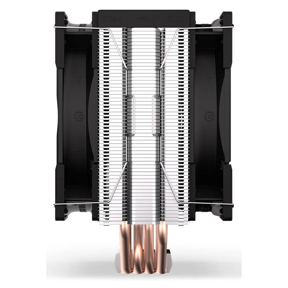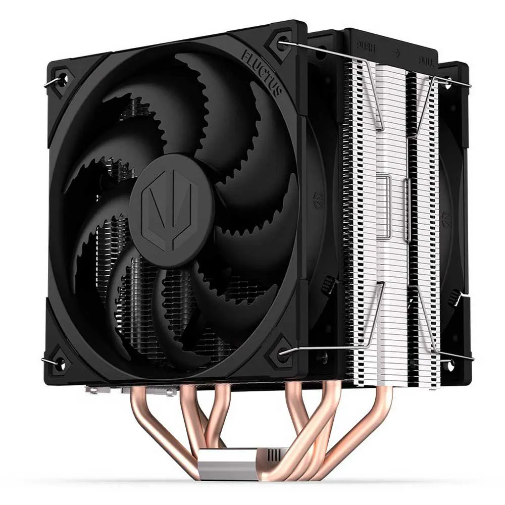 De kracht van de ENDORFY Fera 5 Dual Fan ligt in zijn twee Fluctus 120 PWM ventilatoren met optionele airconditioning semi-passieve modus. Tussen hen in hebben we een dichtgeribbelde koelvin geïnstalleerd – de opstelling werkt in een push-pull configuratie, die de temperatuur van je processor verlaagt. Het is alsof je de computer in een koelkast zet. Het verschil is dat je geen koelkast op populaire CPU-sockets kunt monteren – in tegenstelling tot de ENDORFY Fera 5 Dual Fan).