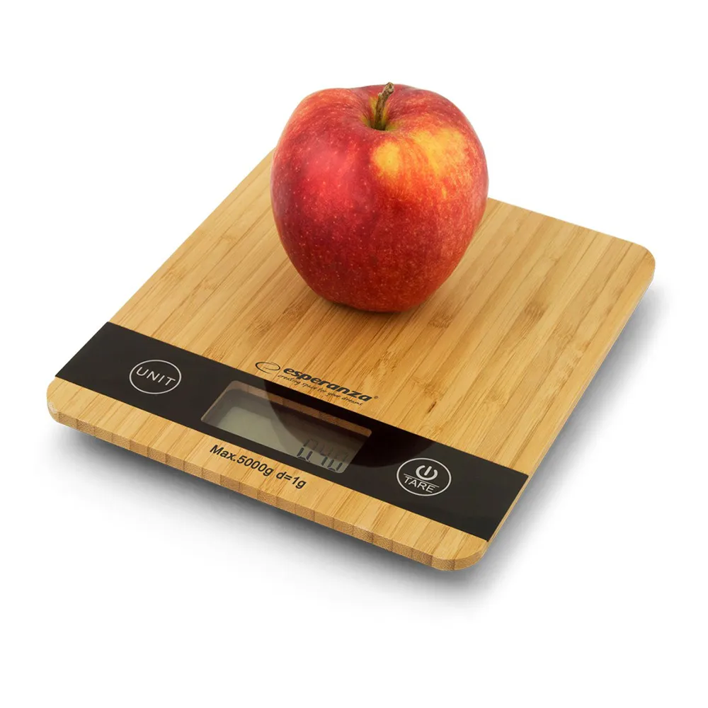 Digitale Keukenweegschaal. Deze is gemaakt van natuurlijk bamboe. Extreem precies, stijlvol design, ultradunne behuizing, een groot display voor gemakkelijk gebruik. Geschikt voor het wegen van alle droge en vloeibare ingrediënten en voedsel.