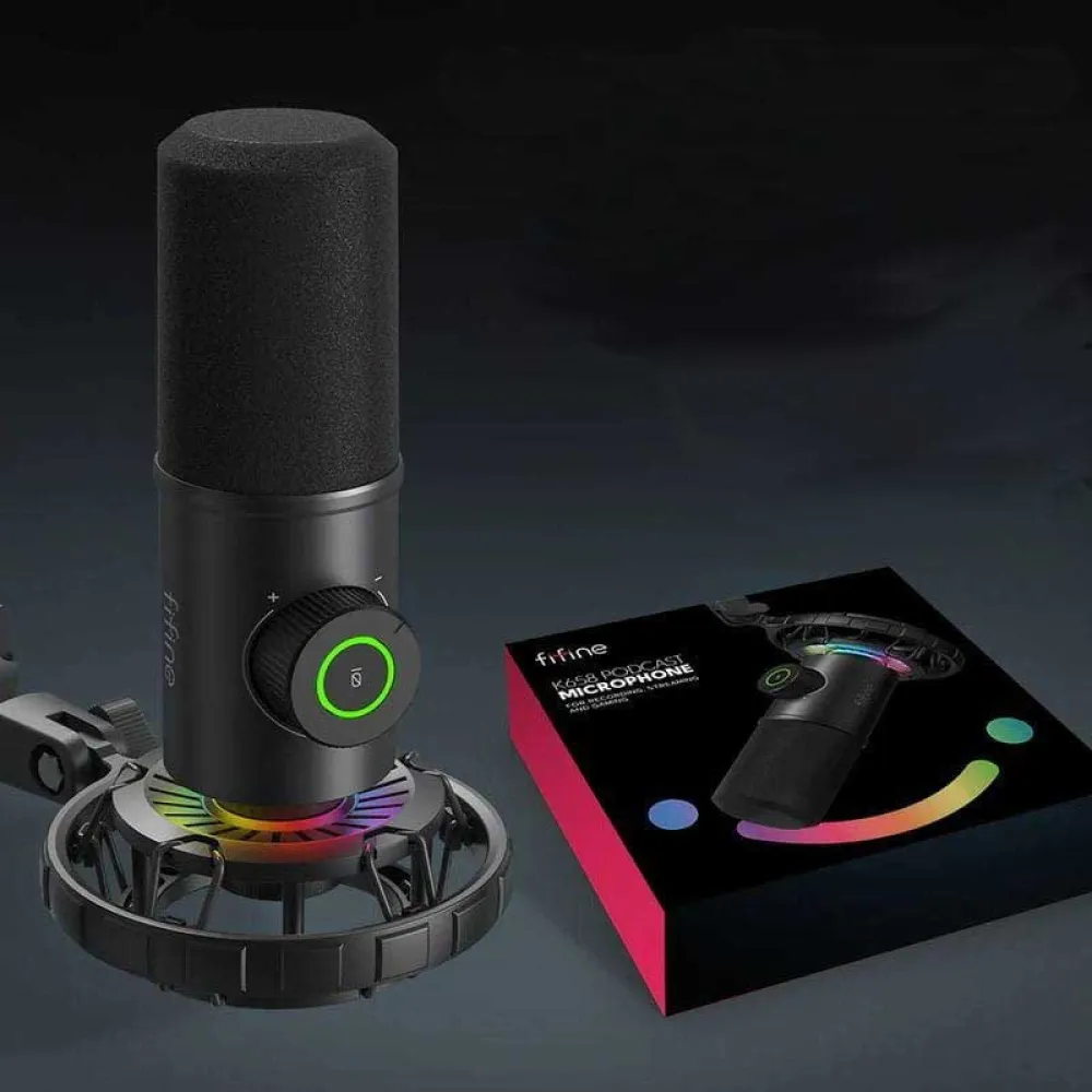 - Uiterlijk trekt ook de aandacht als het gaat om het streamen van je content. Daarom is de Fifine K658 voorzien van RGB LED-verlichting die zowel op de microfoon zelf als op de standaard schijnt. Hij heeft ook een gigantische volumeknop die perfect in je gamingopstelling past. De verlichting kan daarentegen met een druk op de knop worden uitgeschakeld.