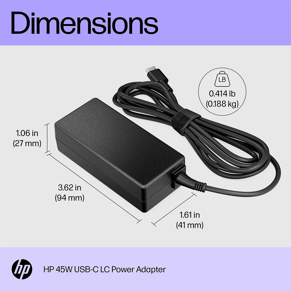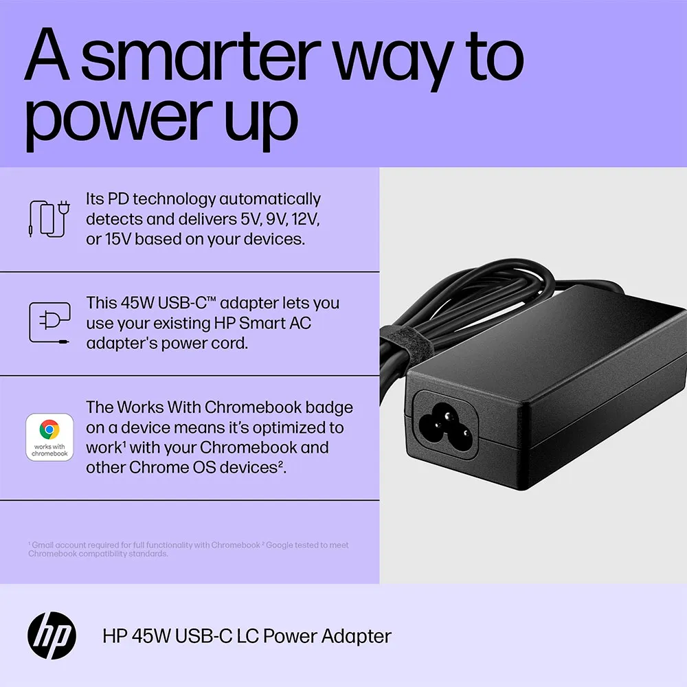 Laad uw HP Chromebook op en voorzie hem van stroom via de USB-C®-poort met de HP 45W USB-C LC-voedingsadapter.