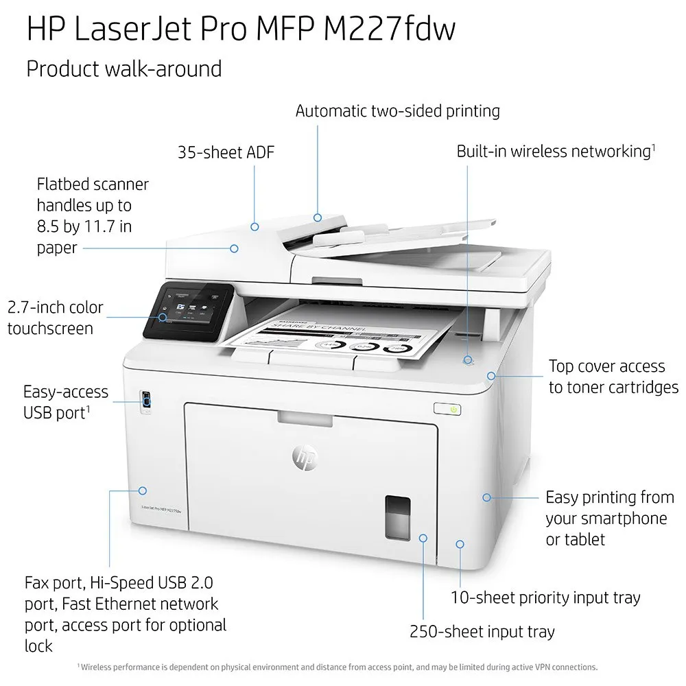 Productbeschrijving van HP LaserJet Pro M227FDW Laser-multifunctionele printer