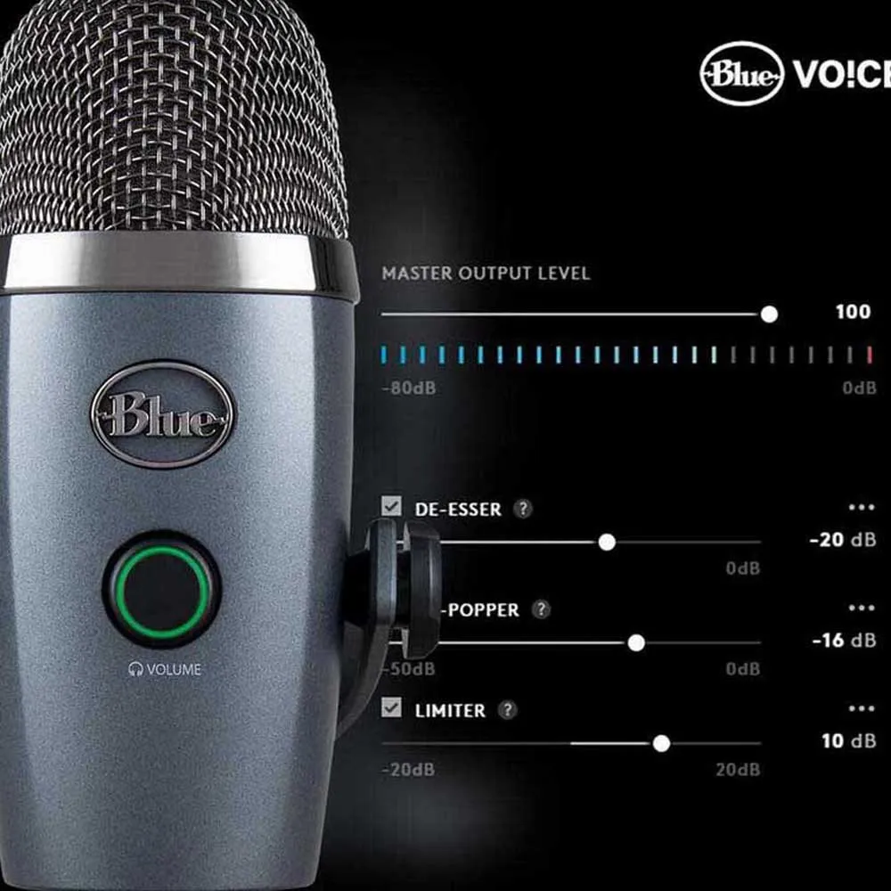 Yeti Nano beschikt over ons blauwe geluid van uitzendkwaliteit uit twee microfooncapsules die speciaal zijn geoptimaliseerd om uw stem een aanwezigheid te geven.