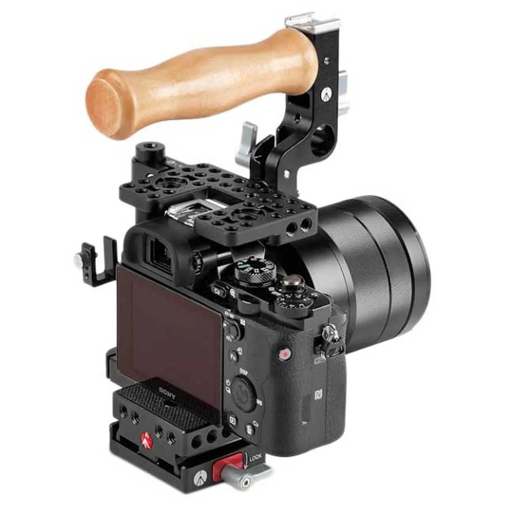 Camera Cage Small is ontworpen voor de Sony A7-serie en Panasonic GH5-camera's, die een bovenaan gemonteerde XLR-audiomodule gebruiken voor geluidsopname. Het minimalistische ontwerp en de lichtgewicht structuur geeft verschillende bevestigingspunten voor uw accessoires aan de boven- en zijkant, inclusief twee antirotatiebevestigingen die compatibel zijn met Manfrotto 244MICRO AR en Arri standaard bevestigingspunten. De kooi heeft een omkeerbare handgreep aan de bovenkant die over het lensgebied kan worden verplaatst wanneer een XLR-adapter in gebruik is. Het handvat kan ook worden neergeklapt bij het inpakken van uw tas en kan zelfs opnieuw worden geconfigureerd op de linker verticale staaf van 15 mm voor een secundaire grip. In het handvat is een koude schoenbevestiging en een buisklem van 15 mm ingebouwd voor het monteren van alle UVF-montagekits voor houten camera's die worden gebruikt met elektronische zoekers van derden. Camera's met uitklapbare LCD-schermen kunnen eenvoudig worden geplaatst en een meegeleverde HDMI-kabelklem kan aan de verticale staaf worden bevestigd om videokabels vast te zetten en poortschade te voorkomen.