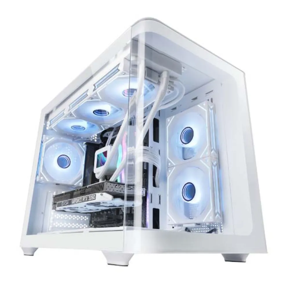 Op maat gemaakte showcase minitower met MicroATX-structuur, volledig zijvenster en voorvenster met gebogen randen van gehard glas.