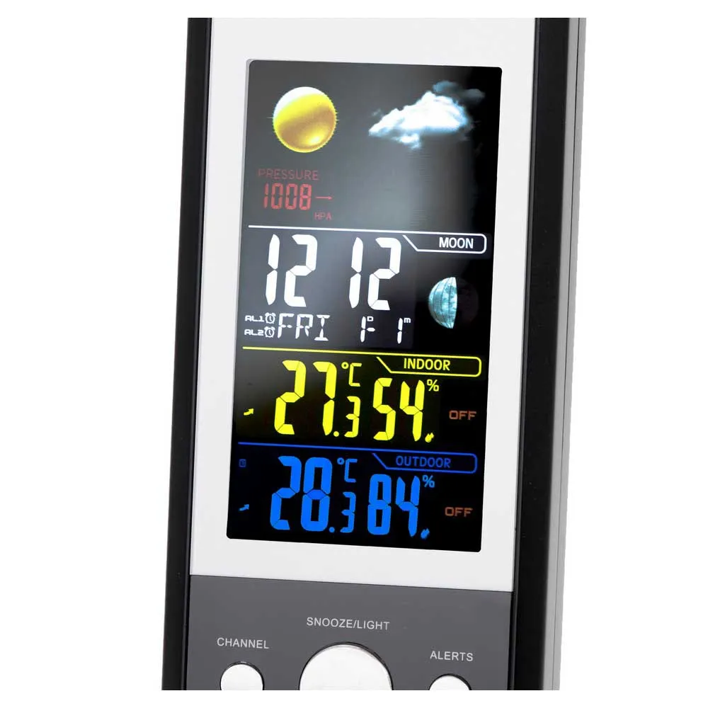 Het weerstation ziet er zeer modern en stijlvol uit, waardoor het in elk interieur interessant zal ogen. Het display is verdeeld in een gedeelte gewijd aan interne en externe metingen, en een centraal gedeelte waar we het geïllustreerde weer buiten het raam, tijd en datum uitgesplitst per dag en maand zien. Het is een echte ruimtebespaarder als één product zoveel functies uitvoert. Daarnaast kunnen we waarschuwingen instellen die ons waarschuwen voor hoge/lage temperaturen en het station gebruiken als wekker. De wekker heeft drie instellingen, die verschillen in de frequentie van geluiden, en een ´snooze´-optie, die ook zal helpen om het juiste niveau van verlichting in te stellen of volledig uit te schakelen. Het is een professioneel apparaat, niet alleen voor professionals die op de hoogte willen blijven van de weersveranderingen buiten het raam.Kenmerken: