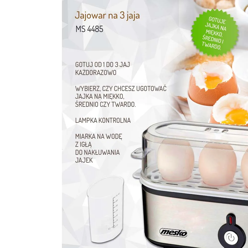 - We weten allemaal dat eieren erg gezond zijn en veel waardevolle voedingsstoffen bevatten. Ieder van ons heeft vast wel een favoriete manier om eieren als ontbijt te bereiden. Ons product is een ideale oplossing voor kleine gezinnen en mensen die veel eieren eten, omdat je er 1 tot 3 eieren tegelijk in kunt koken. Met andere woorden, het bereiden van het ontbijt voor het hele gezin of halffabrikaten voor een eiersalade kost je maar een paar minuten. De set bevat een eierprikker, waardoor de eieren tijdens het koken niet barsten. Bovendien zorgt het kleine formaat ervoor dat je het apparaat in elke kast of plank kunt opbergen, waardoor je ruimte bespaart op het aanrecht.