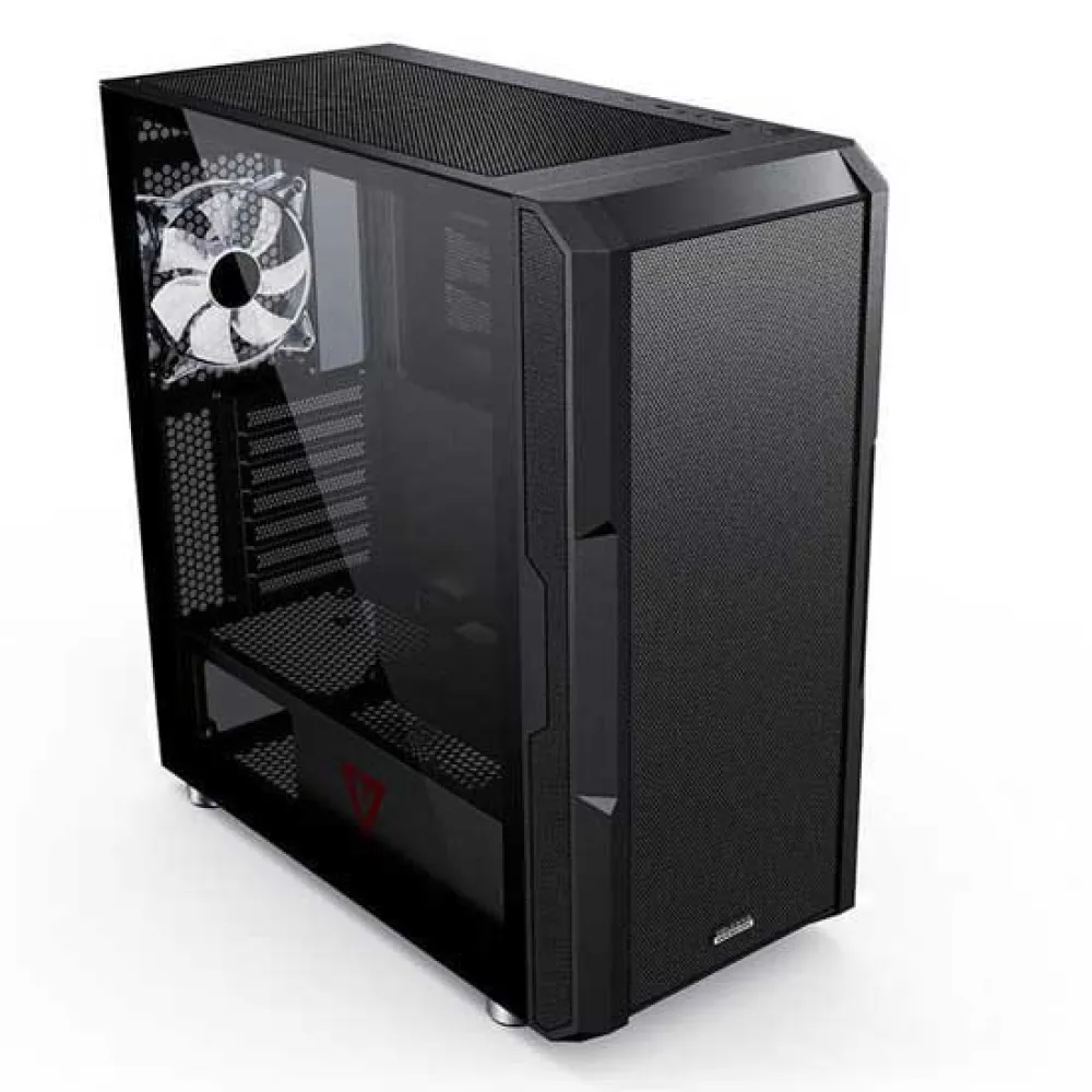 Scharnierend Zijpaneel van Gehard Glas: Een kristalhelder, gereedschapsloos scharnierend zijpaneel van gehard glas biedt een panoramisch zicht op uw componenten en maakt moeiteloze toegang mogelijk voor upgrades en onderhoud.