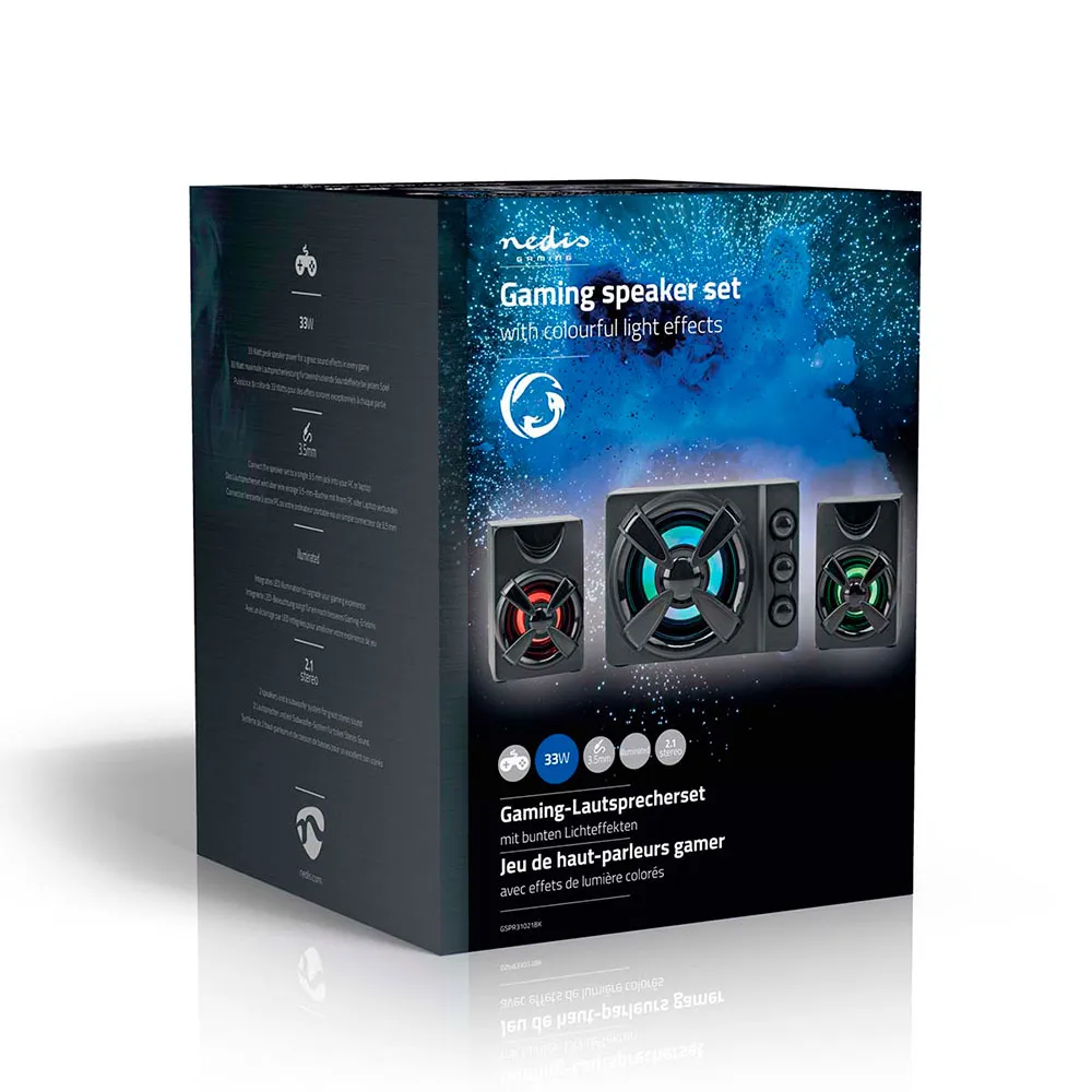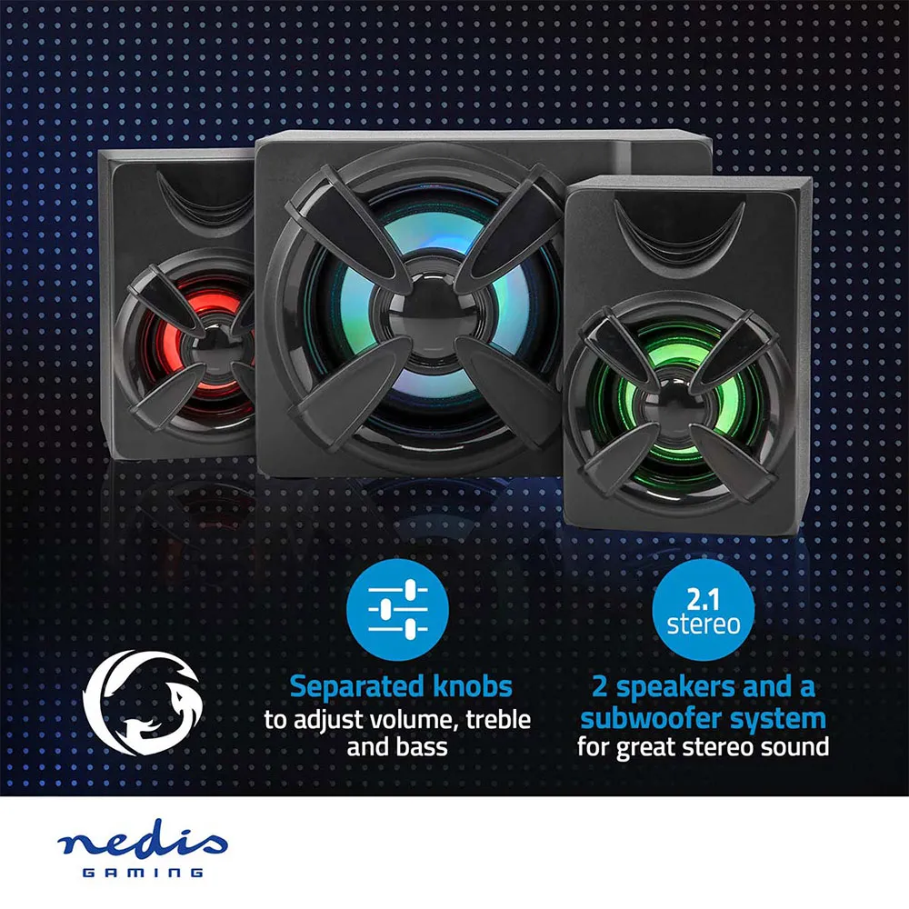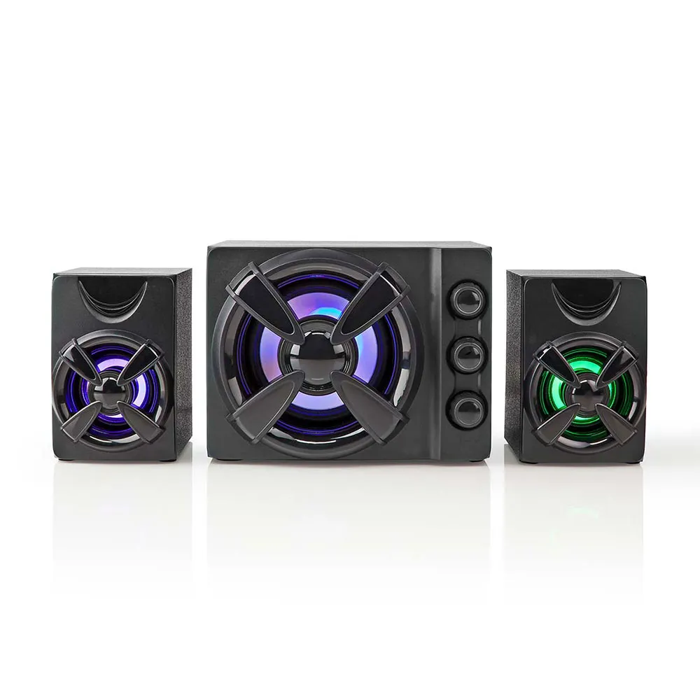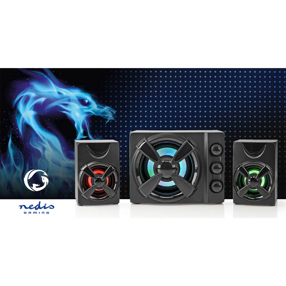 Deze krachtige en stijlvolle Nedis-geluidsset bestaat uit een 2.1-systeem, met 2 satellietluidsprekers en een subwoofer. Met de individuele equalizerknoppen kunt u de hoge tonen, lage tonen of het volume eenvoudig aanpassen. De ingebouwde meerkleurige LED-verlichting zal elke kamer opfleuren.