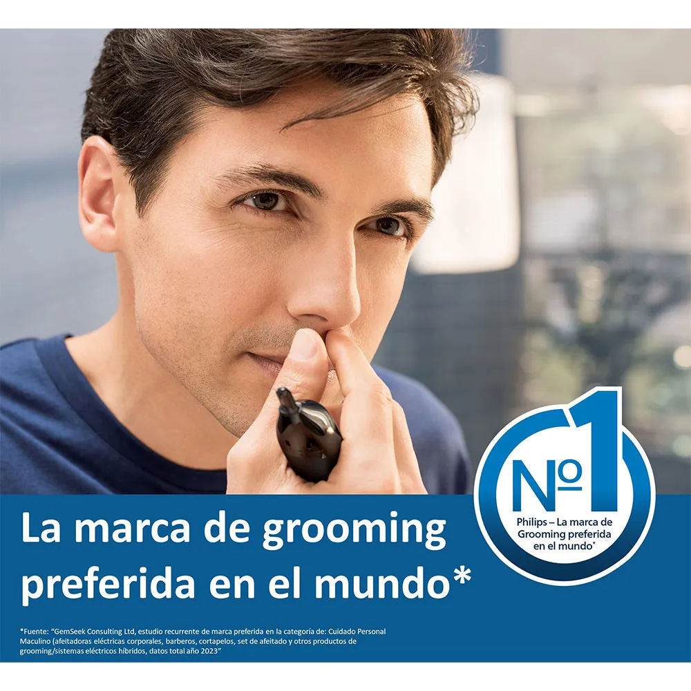 De Philips neustrimmer serie 5000 trimt zachtjes neus-, oor-, wenkbrauw- en detailhaar.