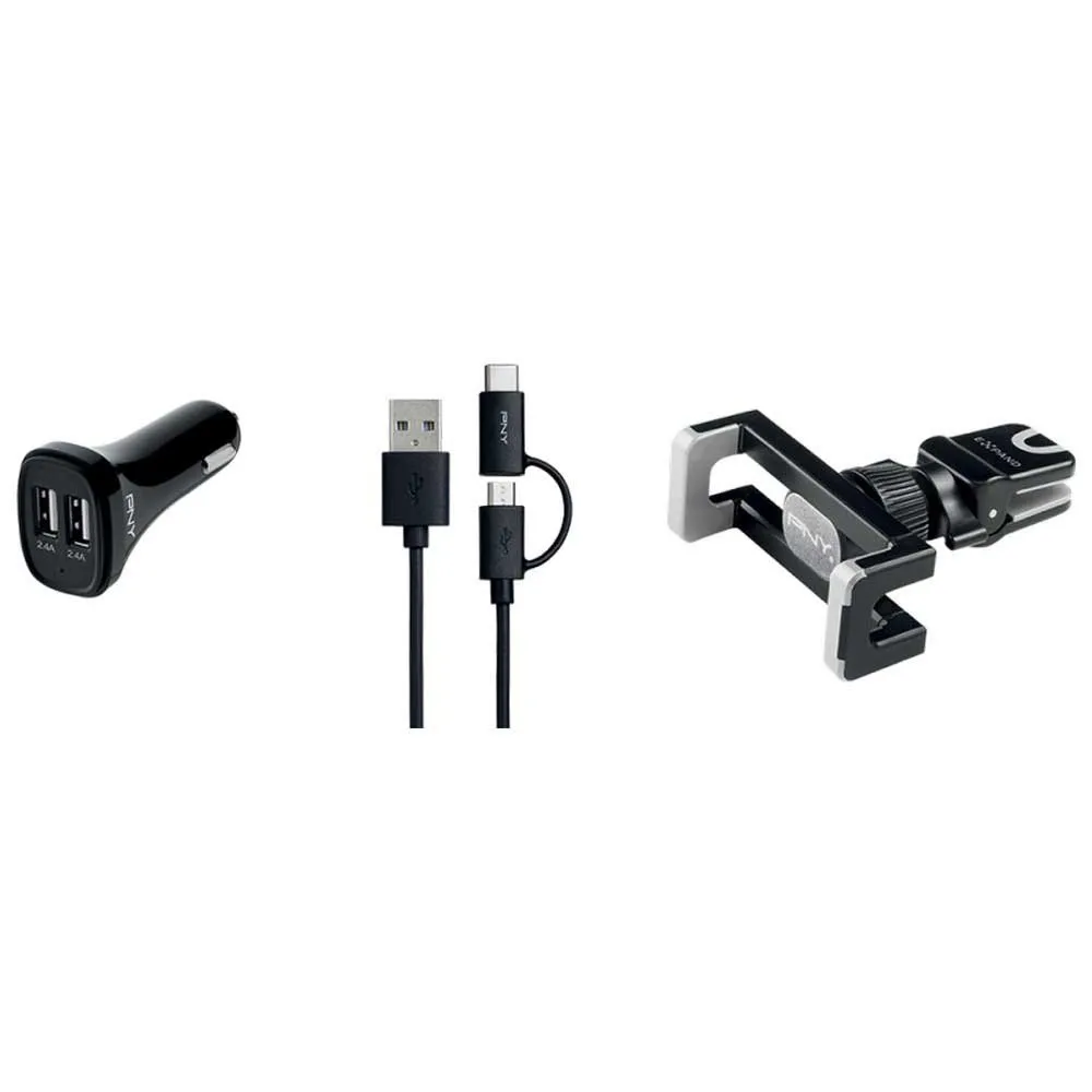 Inclusief de Pny Expand Car Vent Mount, een Dual Car Charger en een 2in1 Type-C/Micro-USB kabel, ben je volledig uitgerust.