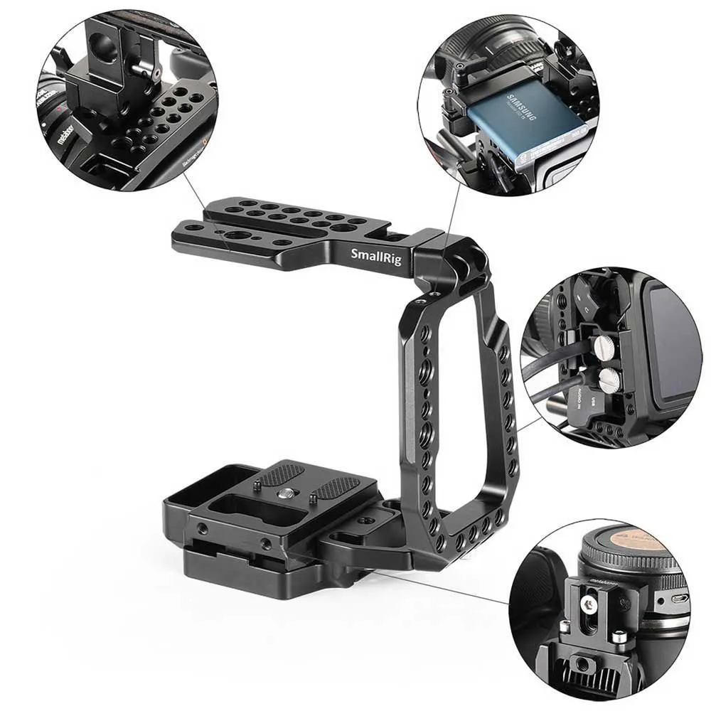 SmallRig QR halve kooi voor Blackmagic Design Pocket Cinema Camera 4K en 6K (oude versie) CVB2255 is een vormsluitende kooi. Het beschikt over een Manfrotto 501PL-plaat in de kooi waardoor de camera snel kan worden losgemaakt in 2 seconden en kan worden overgeschakeld naar Manfrotto 501PL-compatibele statieven. Het is stevig vergrendeld door een 1/4'' 20 schroef aan de onderkant, met extra paspennen en rubberen pads om wiebelen en krassen te voorkomen. Aan de boven- en linkerkant zijn NATO-rails ingebouwd, waar u SmallRig NATO Top Handle 1955 en SmallRig houten NATO Side Handle 2187 aan kunt bevestigen om uit de hand te schieten. Meerdere bevestigingspunten zoals 1/4'' 20 & 3/8''16 schroefdraadgaten, cold shoe en ARRI-locatiegaten zijn perfect voor het bevestigen van accessoires. Voor gebruikers die opnemen met SmallRig is Samsung T5 SSD Mount 2245 een goede keuze. De kooi is compatibel met SmallRig HDMI & USB C-kabelklem 2246 om de kabels te bevestigen. Het werkt met SmallRig Lens Mount Adapter Support 2247 om uw lens stabiel te houden. Bevestig de SmallRig-basisplaat voor BMPCC 4K 2267 aan de onderkant van de kooi om 15 mm railondersteuning te bieden op 85 mm staafhoogte. De kooi zorgt voor een onbelemmerde cameragreep, knop, poort, ventilatie en toegang tot de batterij.