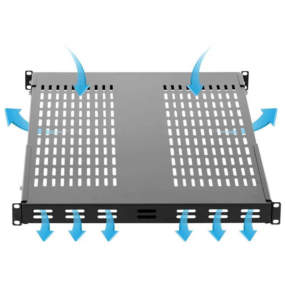 Deze zware rackmontageplank kan worden aangepast van 49.5 cm tot 96.5 cm (montagediepte) om in uw rack te passen, terwijl het geventileerde ontwerp de luchtstroom verbetert en helpt de temperatuur in het rack te verlagen.