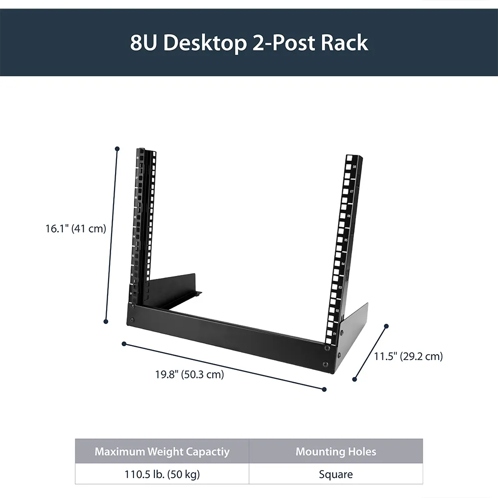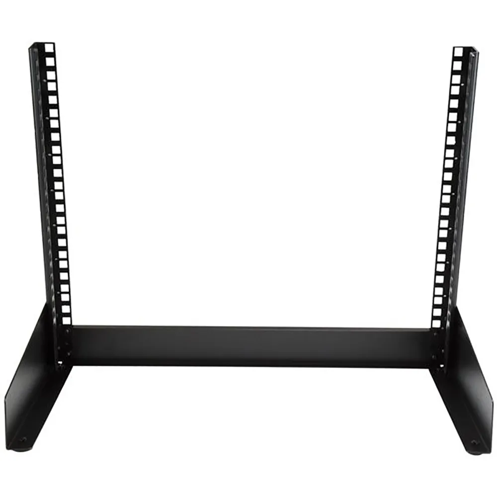 Deze 2-post desktop rack biedt 8U aan opslagruimte voor het monteren van kleinere A/V- en IT-apparatuur.