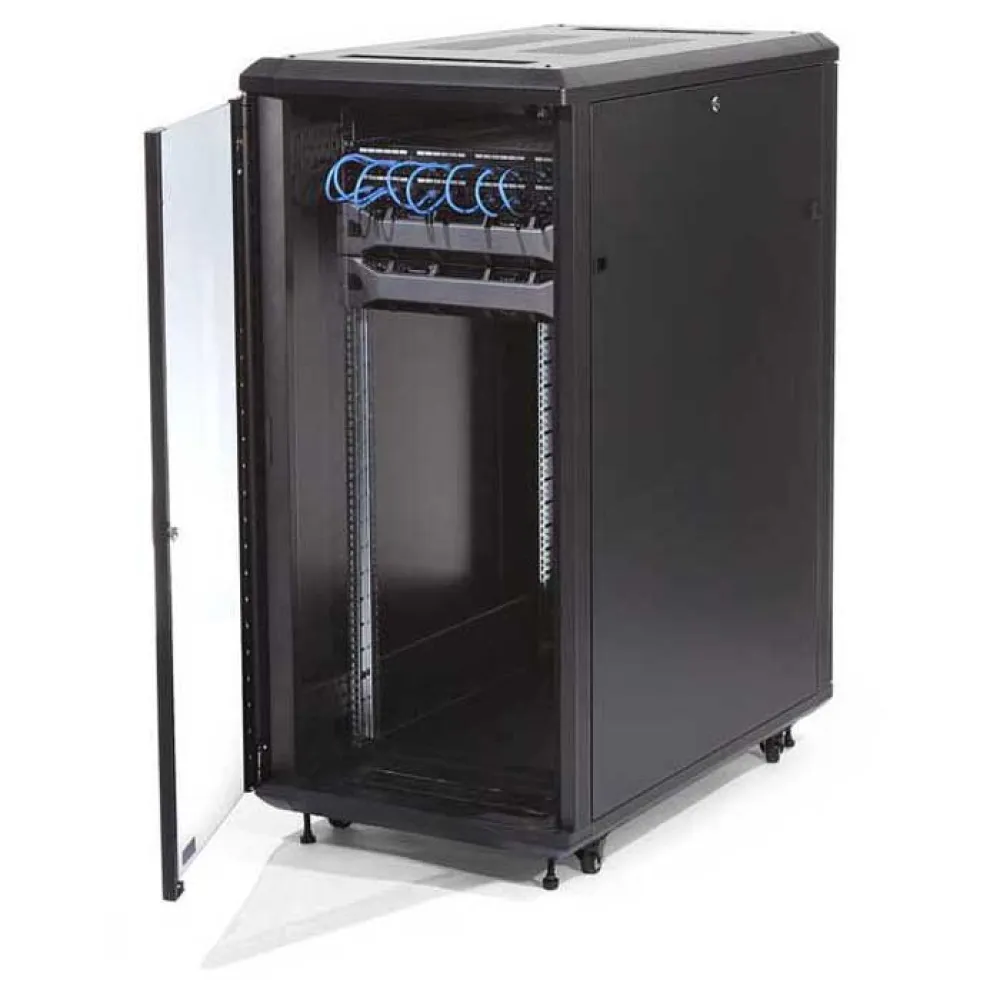 - De achterdeur van het rek is van gaas en de voordeur van glas is geventileerde, die samenwerken om de luchtstroom te vergroten om passieve koeling te bieden die kosteneffectief is en ervoor zorgt dat uw apparatuur op een optimale temperatuur werkt.