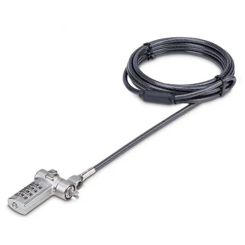 - 3-in-1 universeel laptopslot: compatibel met Noble Wedge, K-Slot (T-Bar) en Nano slotten via verstelbare sluittip - 2 m, 4,4 mm dik snijvast carbonstalen kabel - Tot 91,6 kg trekkracht