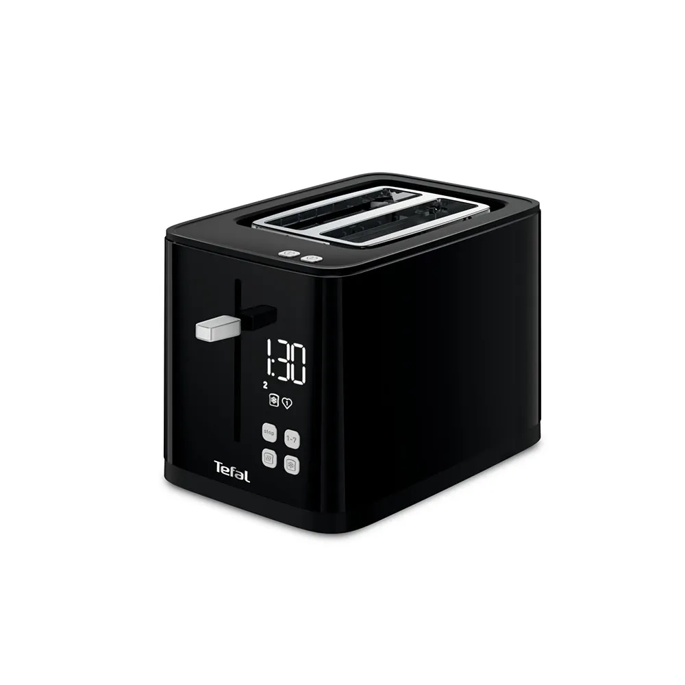 Geniet van perfect gebruinde toast met de slanke, volledig zwarte Tefal TT6408 broodrooster. Het minimalistische digitale scherm toont een live aftelling voor nauwkeurige controle. Kies uit 7 bruiningsniveaus en sla je ideale instelling op met de favorietenfunctie voor gemak met één druk op de knop. Deze moderne broodrooster bevat ook speciale Stop-, Ontdooi- en Opwarmfuncties, automatische broodcentrering voor gelijkmatige resultaten, een hoge liftfunctie voor eenvoudig verwijderen en een uitneembare kruimellade voor eenvoudige reiniging. Een verfijnde toevoeging voor elke keuken. EU-stekker