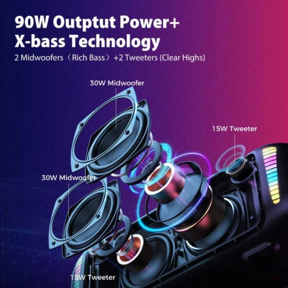 - De Tribit StormBox Blast speaker heeft een vermogen van 90 W, bestaande uit 2x30 W basspeakers en 2x15 W tweeters, die samen met de XBass-functie zorgen voor een uitgebalanceerd en levendig geluid zonder vervorming. Met deze speaker is het heel gemakkelijk om feestjes op te vrolijken.