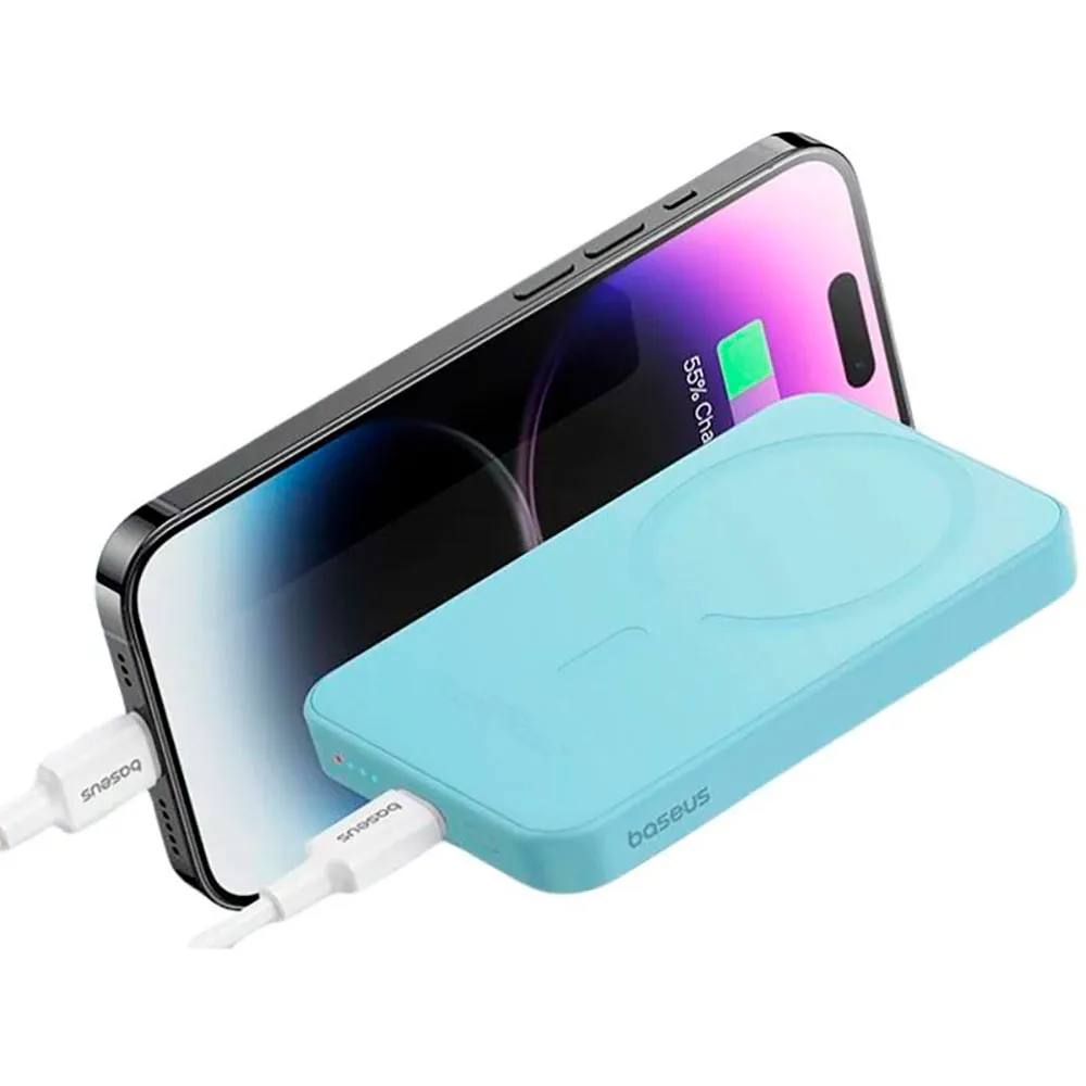 Baseus 5000mAh Mini Power Bank med USB-C-kabel, 20W hurtiglading og kompatibel med Apple MagSafe, blå farge.