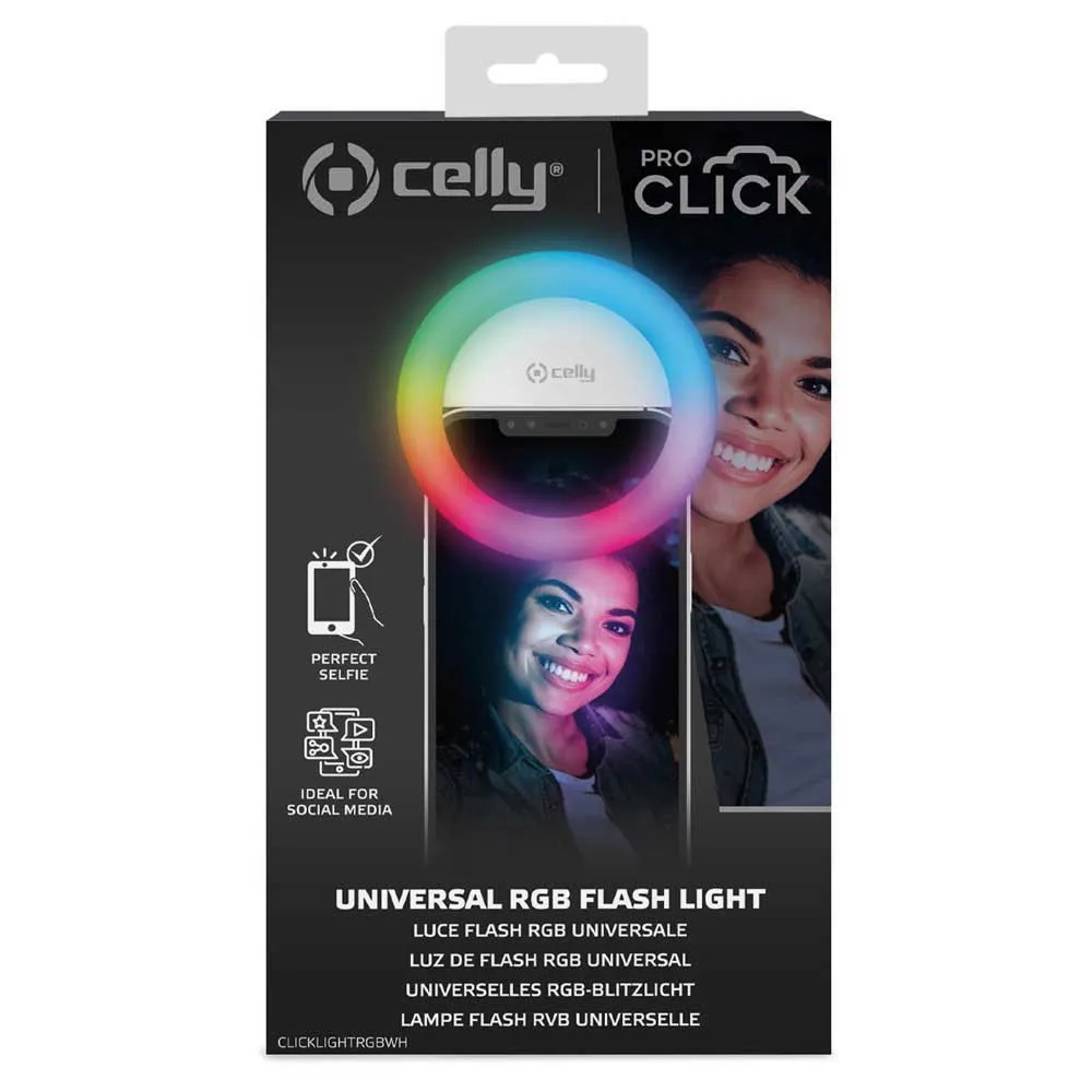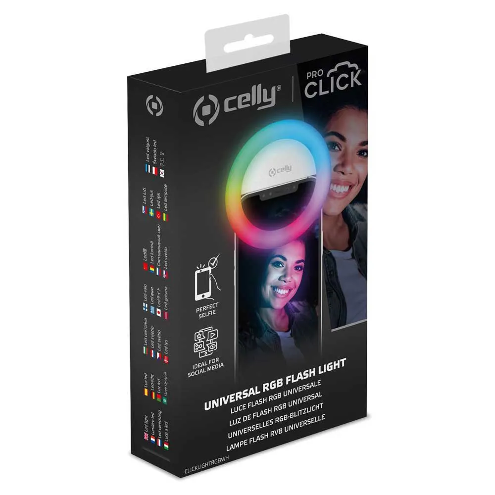 Det uunnværlige verktøyet for å lage perfekt sosialt innhold! CLICKLIGHTRGB er en lomme og universal selfie-lys med RGB-lys, med en åpningsklemme på opptil 1,7 cm bred, slik at den kan tilpasses alle smarttelefoner og til alle nettbrett eller bærbare datamaskiner. CLICKLIGHTRGB tilbyr 3 nivåer av lysintensitet, forskjellige fargemuligheter takket være integrerte RGB-lys, inkludert hvitt, blått, gult, rødt og grønt, og flere dynamiske lysmoduser. Med bare 8,5 cm i størrelse er denne selfie-lampen kompakt, lett og bærbar: du kan enkelt bære den med deg i vesken eller ryggsekken .Når den er tom for batteri, er CLICKLIGHTRGB lett oppladbar: bare koble den til en lader via Micro Usb-kabelen (inkludert i pakken).Kompatibil med forskjellige smarttelefonmodeller: Apple , Samsung , Motorola , Xiaomi, OPPO , Huawei , TCL , Alcatel. Vivo, Realme, Honor.