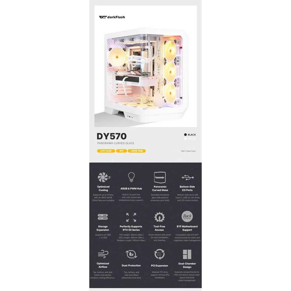 Løft PC-byggingen din til et kunstverk med DARKFLASH DY570 Large ATX PC-tårnkabinett. DY570 er designet for entusiaster som krever både fantastisk estetikk og kompromissløs ytelse, og sprenger grensene for tradisjonell kabinettdesign. Den revolusjonerende 270-graders panoramautsikten, skapt av sømløse front- og sidepaneler i herdet glass, gir en fullstendig uhindret fremvisning av dine high-end komponenter, og forvandler gamingriggen eller arbeidsstasjonen din til et slående midtpunkt.