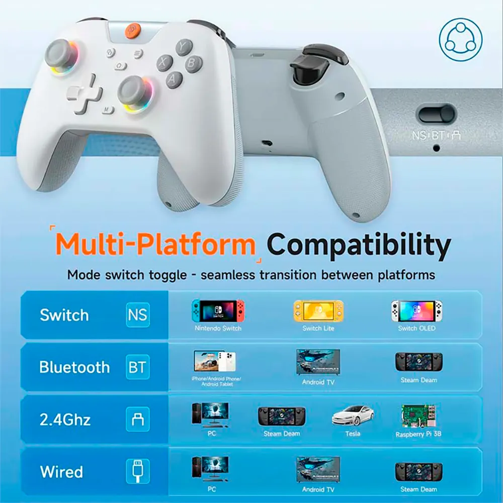 I tillegg har den også forskjellige RGB-lyseffekter for å gi en distinkt effekt, en keramisk antennebrikke som forbedrer stabiliteten til trådløse tilkoblinger og reduserer latens, og en praktisk modusbryter for enkelt å bytte mellom PC, iOS, Android, Switch og Steam Deck.