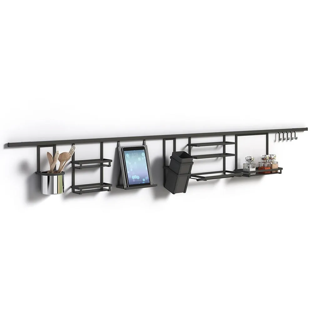 Serie med tilbehør som kan monteres på veggen i kjøkkenet. Nå vil du ha alle verktøyene dine innen rekkevidde og mer plass på kjøkkenbenken til å jobbe som om du var i en stor restaurant. Dens elegante design i antrasittgrått og den flate stålstrukturen er de siste trendene innen kjøkkendesign. Kjent for å henge fra en aluminiumsprofil montert på veggen med skjulte støtter. De forskjellige tilbehørene henger fra baksiden av profilen og gir et rent utseende. Det er tilgjengelige forskjellige tilbehør med sine optimaliserte dimensjoner for å utnytte lagringskapasiteten mest mulig. Det brede utvalget inkluderer redskapsholdere, krydderglassholdere og hengende kroker. Også en praktisk rullholder for kjøkkenpapir, plastfolie og aluminiumsfolie, en krombestikkholder, knivholder og en nettbrettholder for å følge oppskrifter på en enkel og sikker måte på kjøkkenet.