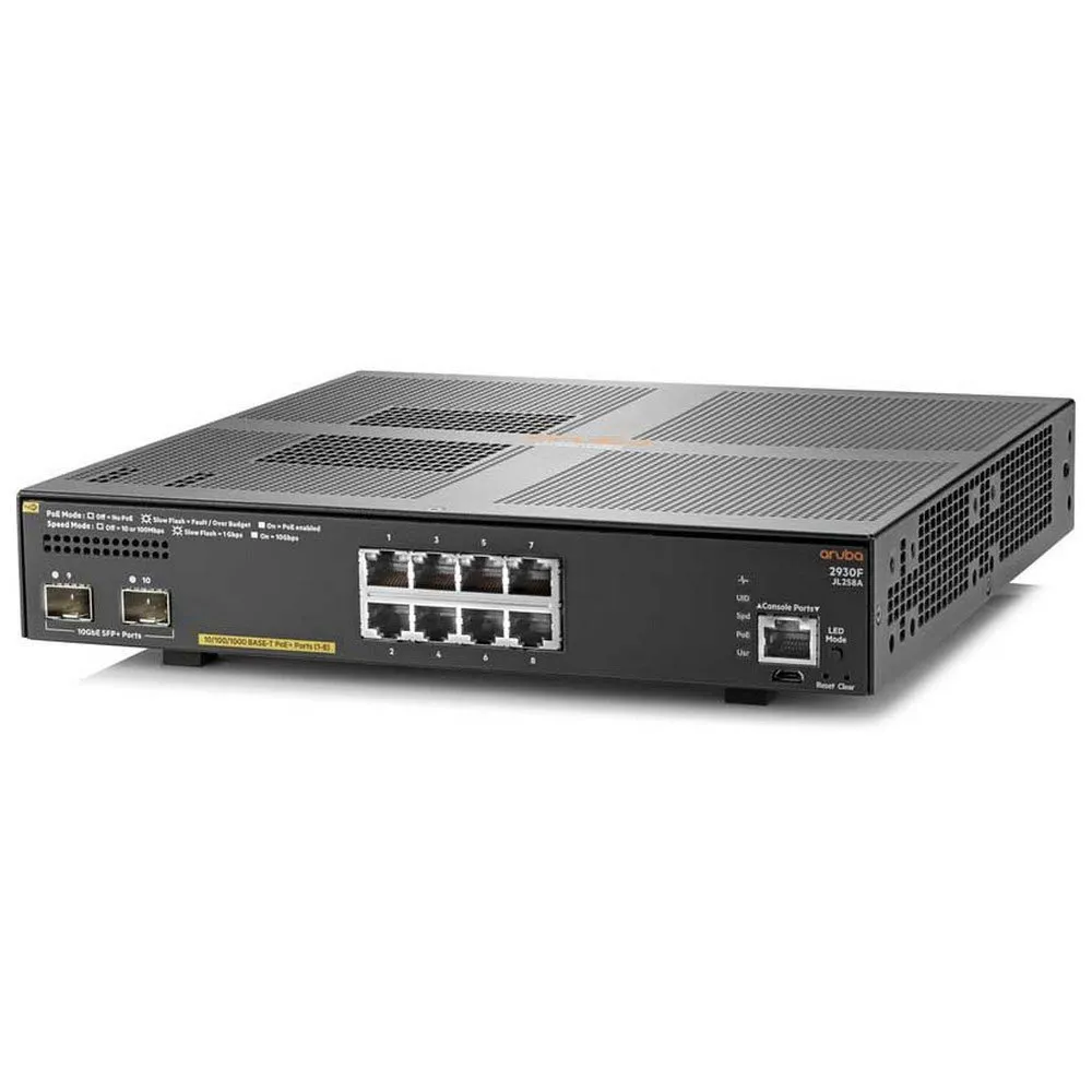 - Aruba, et Hewlett Packard Enterprise-selskap 2930F 8G PoE+ 2SFP+.