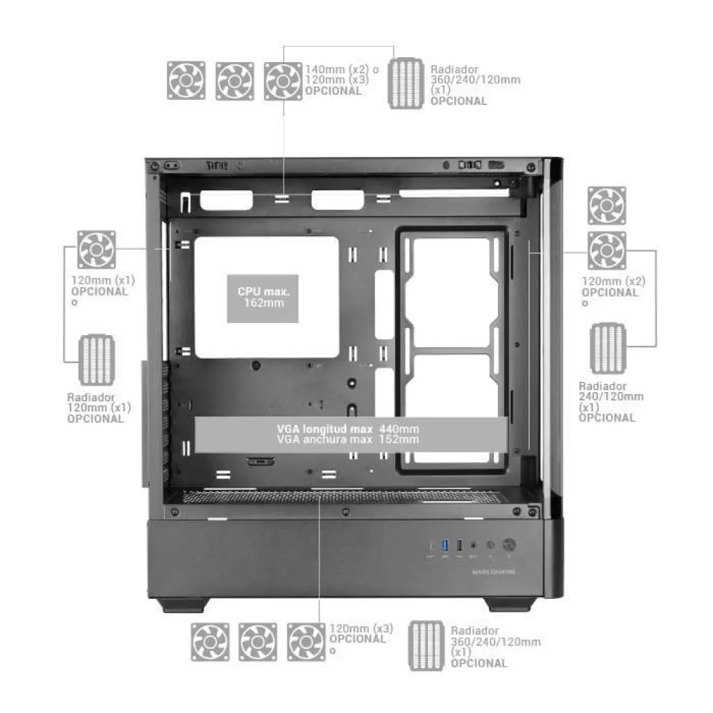 Side fans diameters supported:120 mm, Rear fans diameters supported:120 mm, Top fans diameters supported:120,140 mm.