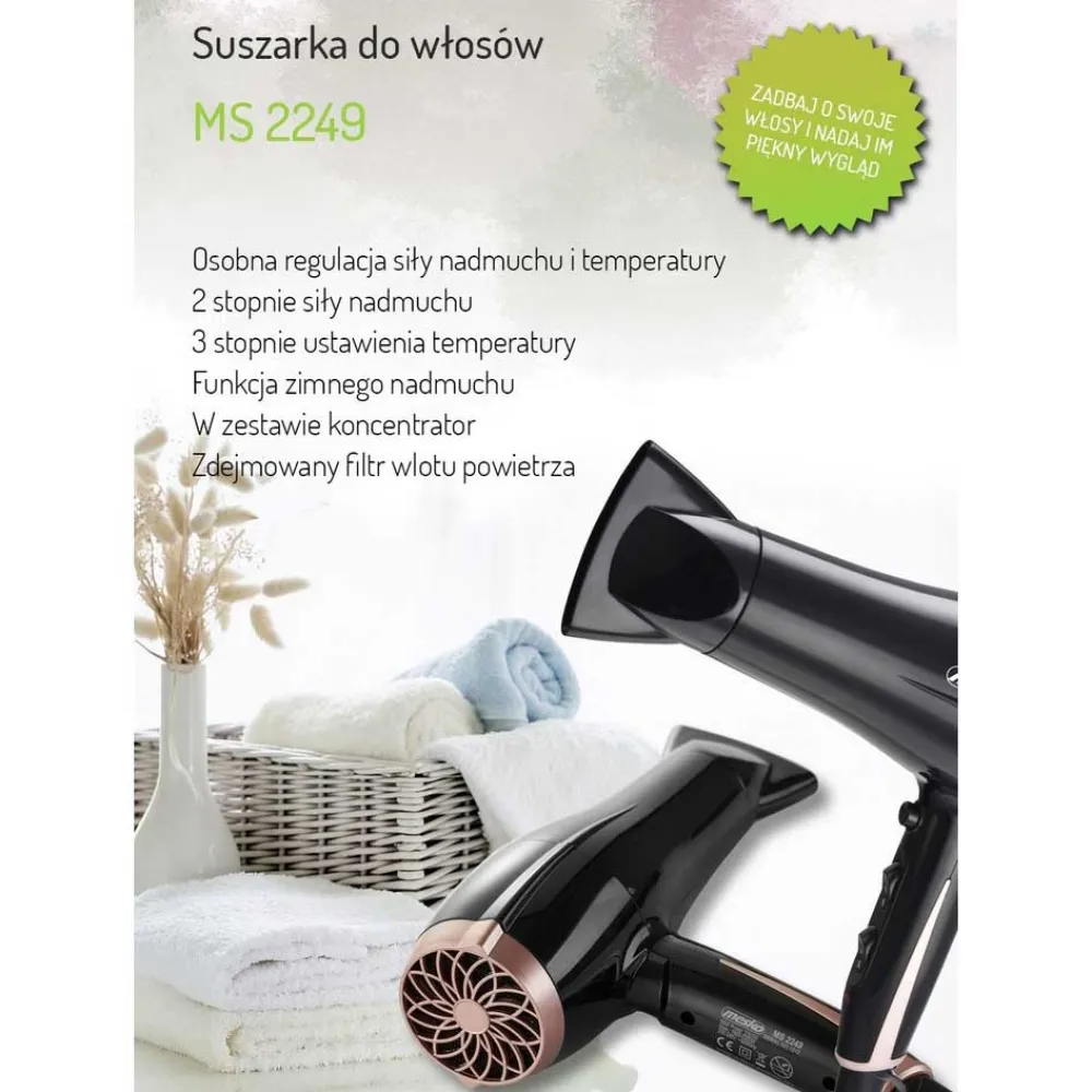 Hårfoenen MS 2249 er et valg for mer krevende personer som bryr seg om håret sitt og ønsker å gi det et vakkert utseende. Foenen er utstyrt med regulatorer for både luftstyrke og temperatur, inkludert kaldluftfunksjon. Foenen har et moderne utseende. Avtakbart luftinntaksfilter gjør rengjøring enklere.