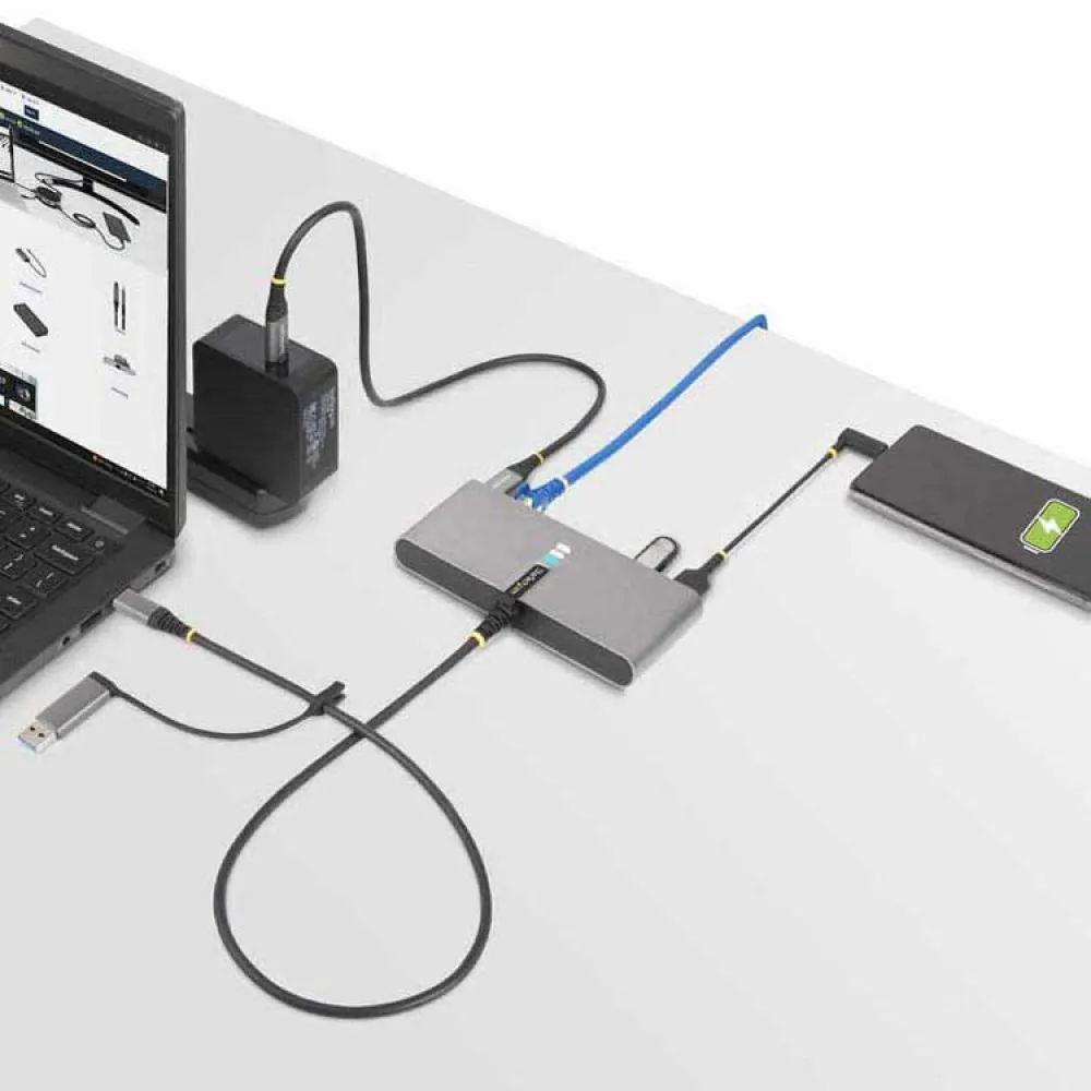 Koble til en ekstern USB-C-strømadapter (ikke inkludert) for å få 100W Power Delivery 3.0 pass-through-strøm.