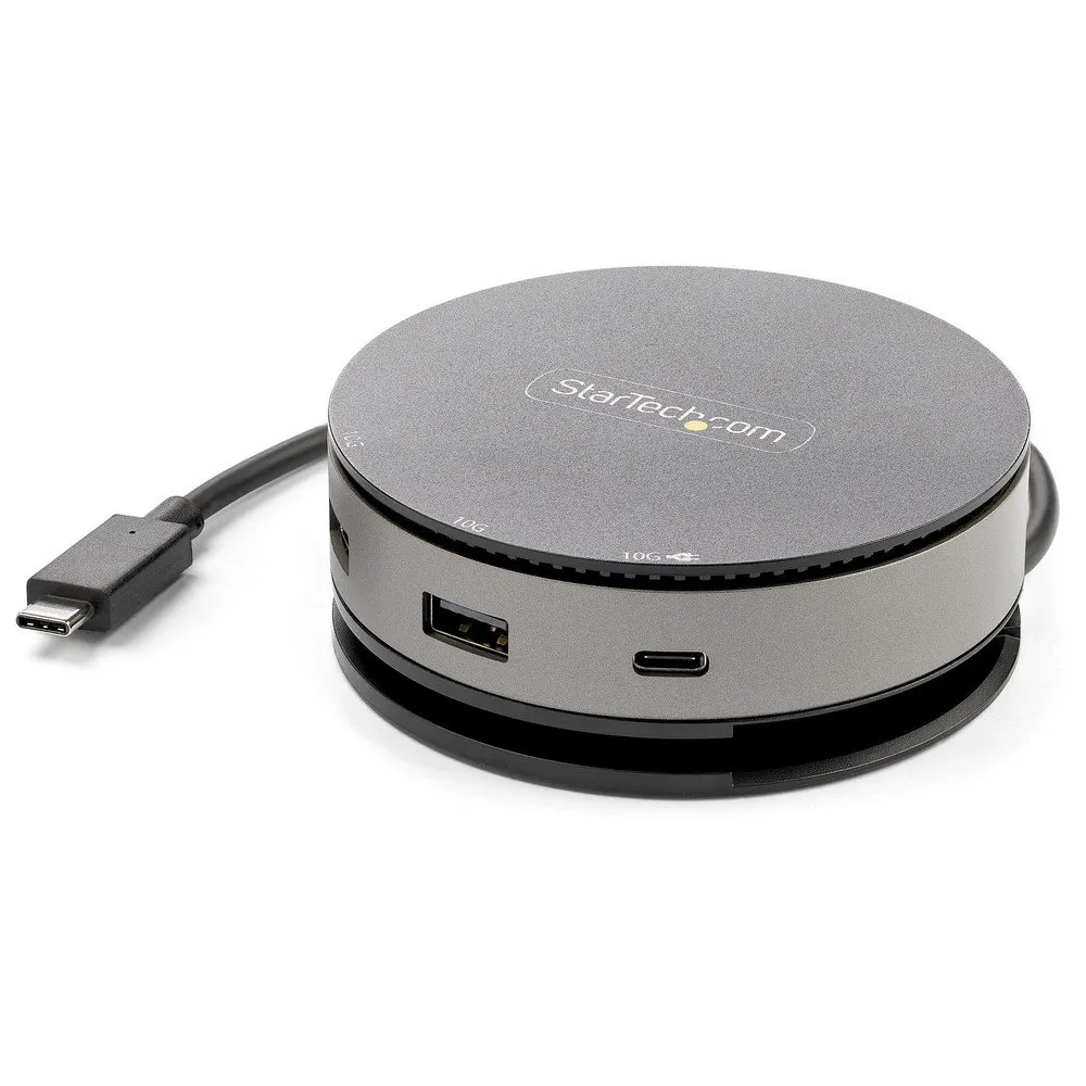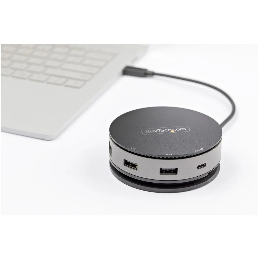USB 3.2 Gen 2 Type-C-hub-adapteren har en unik, bærbar, sirkulær design og alle de viktigste tilkoblingsmulighetene for HDMI-, DisplayPort- og VGA-video: