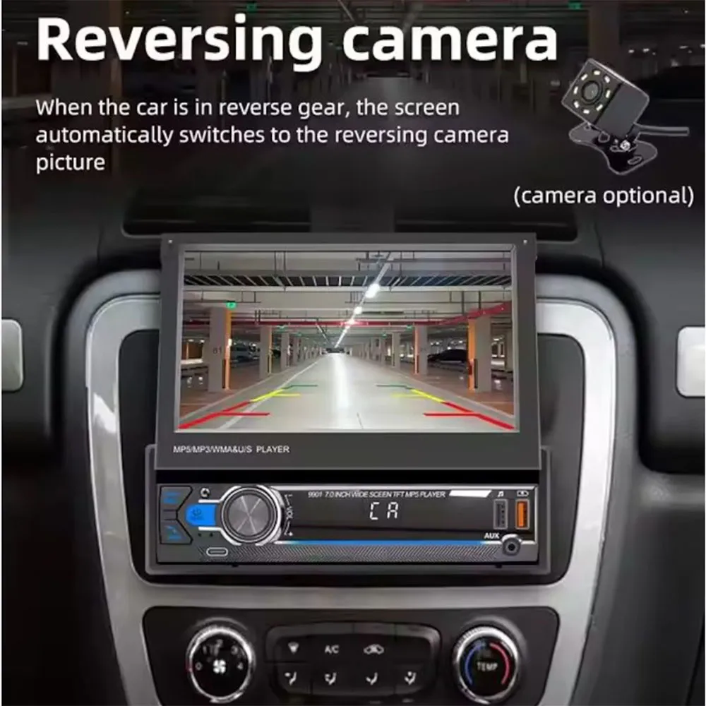 SWM 9901, 1 DIN bilradio med 7-tommers uttrekkbar skjerm, kompatibel med MP5 og USB-lading.