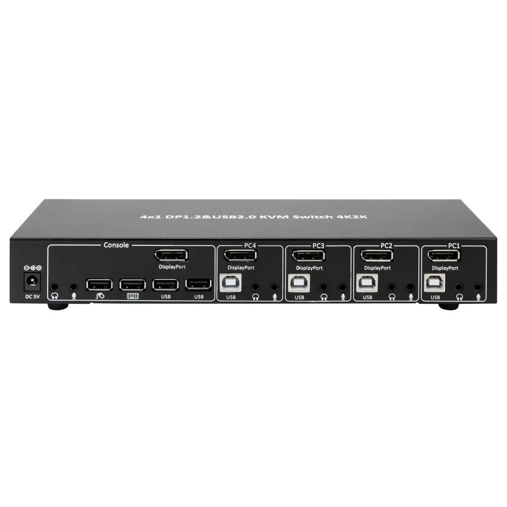 -KVM-svitsj som kan administrere fire datamaskiner gjennom en enkelt DisplayPort-skjerm, USB-tastatur, USB-mus og andre USB 2.0-enheter.