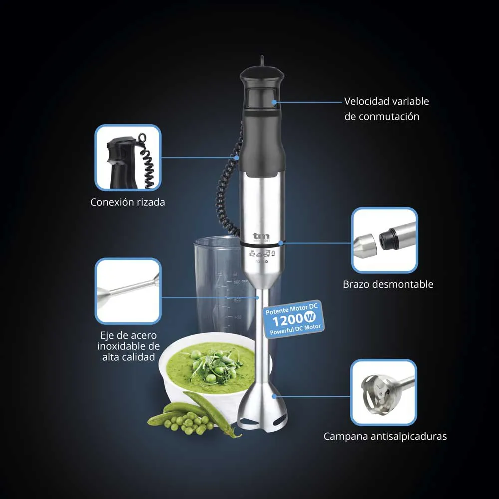 TMPBA017 stavmikseren med 1200W kraft, klokke og skaft i rustfritt stål, 900 ml gradert kopp, 500 ml hakker med giret lokk og skarpt knivblad i rustfritt stål, metallstenger designet for å blande mat, ergonomisk og sklisikkert håndtak fra TM Electron element i ethvert kjøkken i dag da det lar deg blande eller slå små mengder, og tar også minimalt med plass.