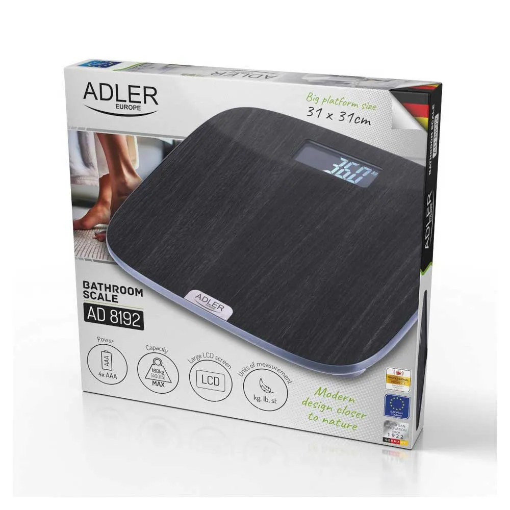 Waga łazienkowa Adler AD 8192 łączy w sobie nowoczesny design z zaawansowaną technologią, dzięki czemu jest idealnym wyborem do każdego domu. Wyposażona w wysokiej jakości czujniki i wytrzymałą platformę, gwarantuje dokładne pomiary i długotrwałą wytrzymałość. Antypoślizgowa powierzchnia i wykończenie imitujące drewno nadają jej stylowy wygląd, który pasuje do każdej łazienki.