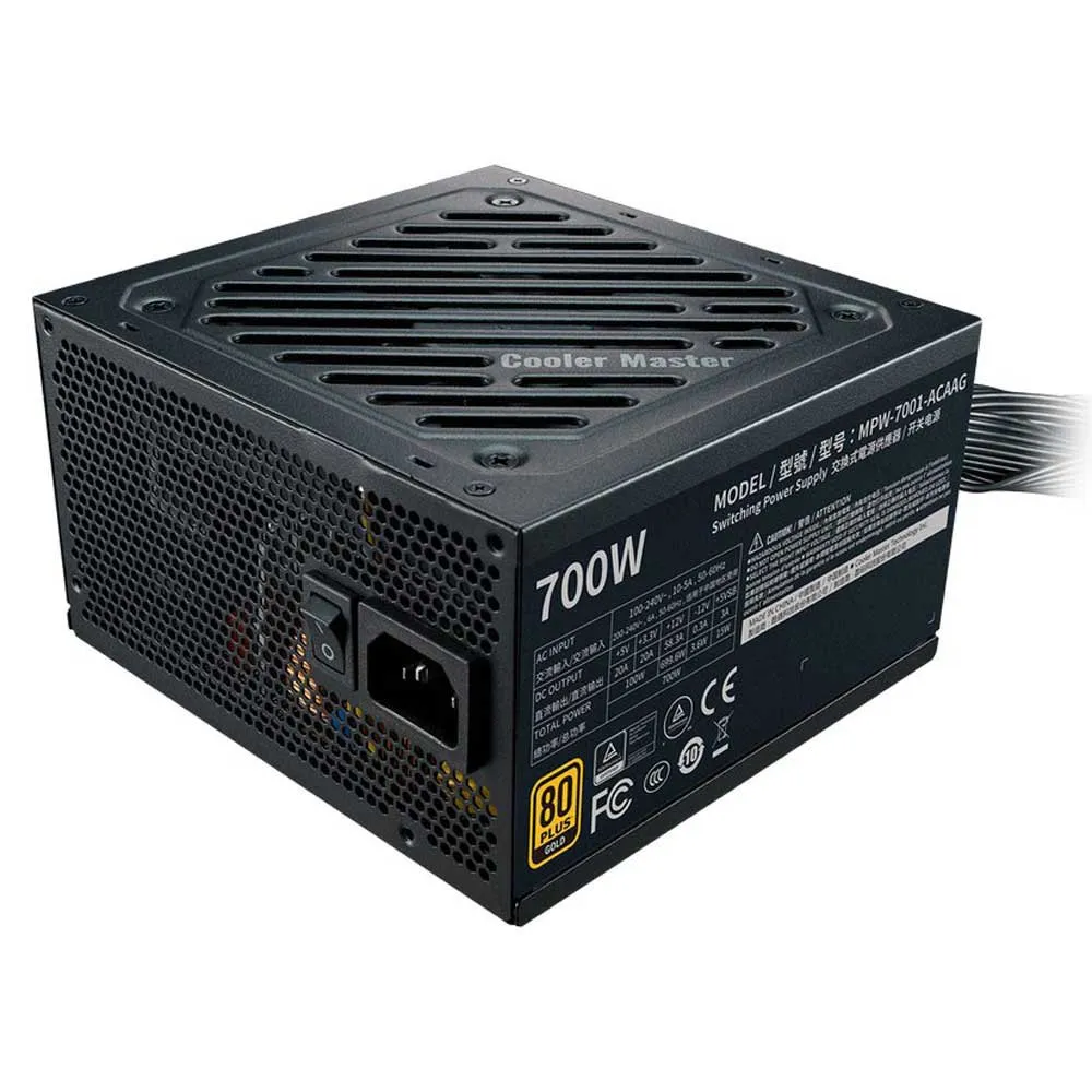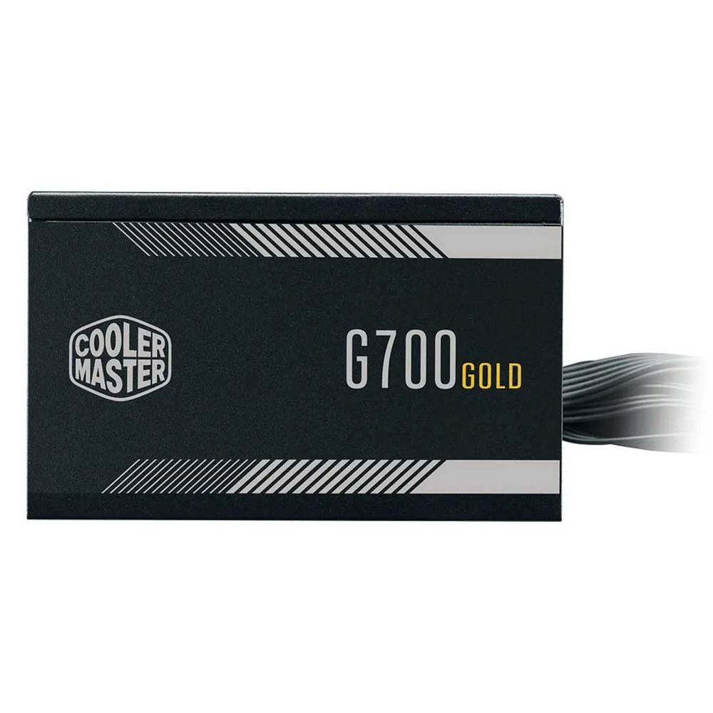 Zasilacz Cooler Master G700 Gold 80+ Gold ATX 700W Non-Modular, Aktywne PFC, Wentylator 120mm, Łożysko wentylatora Hdb, Sprawność przy typowym obciążeniu 90%, Certyfikat 80 Plus Gold, 1 x Złącze ATX 24 piny, 1 złącze EPS 4+4-pin, 1 złącze EPS 8-pin, 6 złączy SATA, 3 złącza peryferyjne 4-pin, 4 złącza PCI-e 6+2-pin.